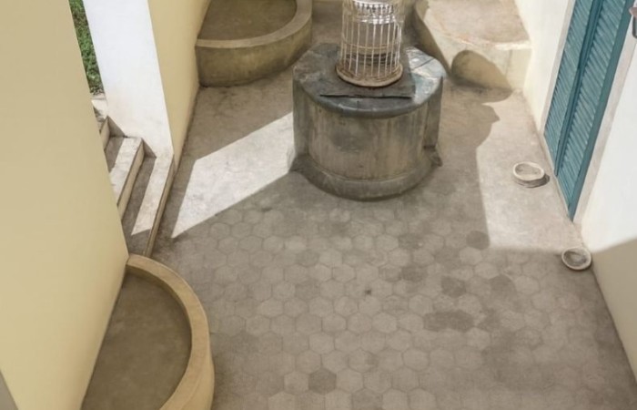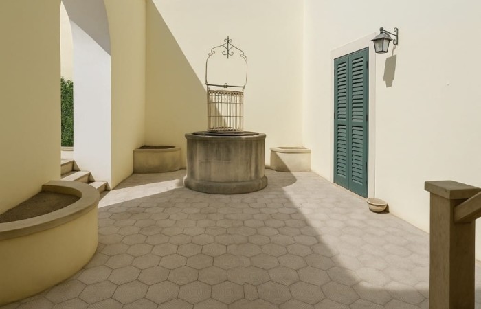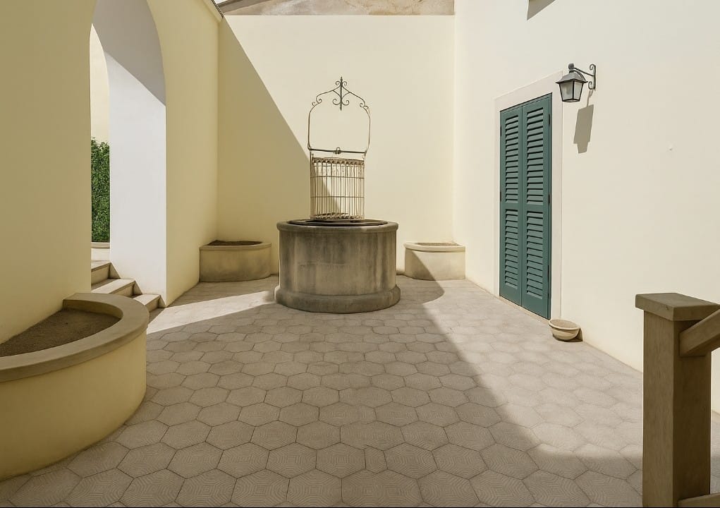 All’esterno, un ampio e soleggiato cortile con un antico pozzo in pietra rappresenta uno spazio ideale per momenti di relax e convivialità all’aperto.