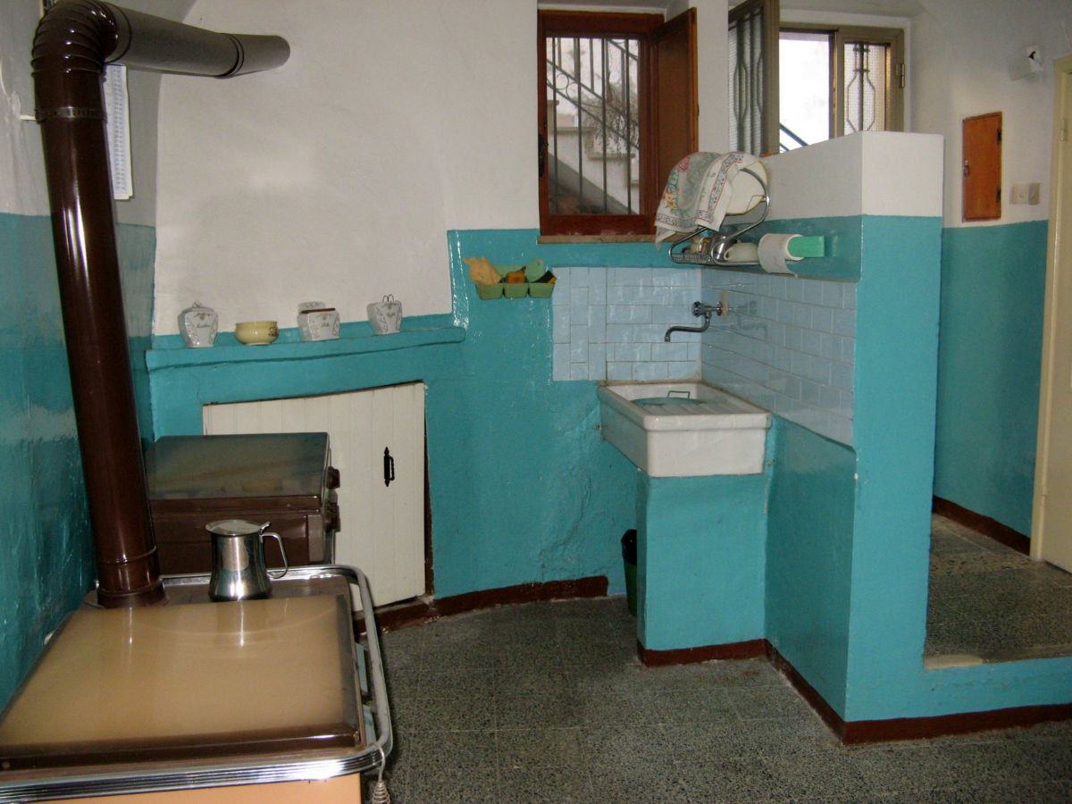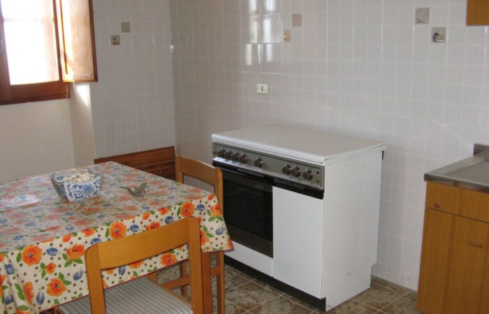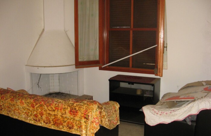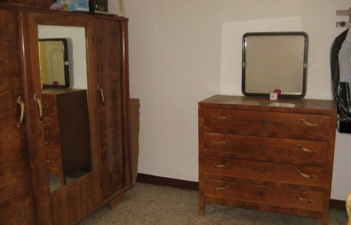 Il piano superiore ha accesso con una scala esterna coperta da tettoia, entrando si incontra un soggiorno con camino, un bagno con vasca/doccia ed un ripostiglio con vaschetta lavatoio e spazio per la lavabiancheria. Segue quindi un’ampia cucina abitabile con finestra panoramica ed una camera da letto matrimoniale con balcone coperto da tettoia che affaccia sul cortile.