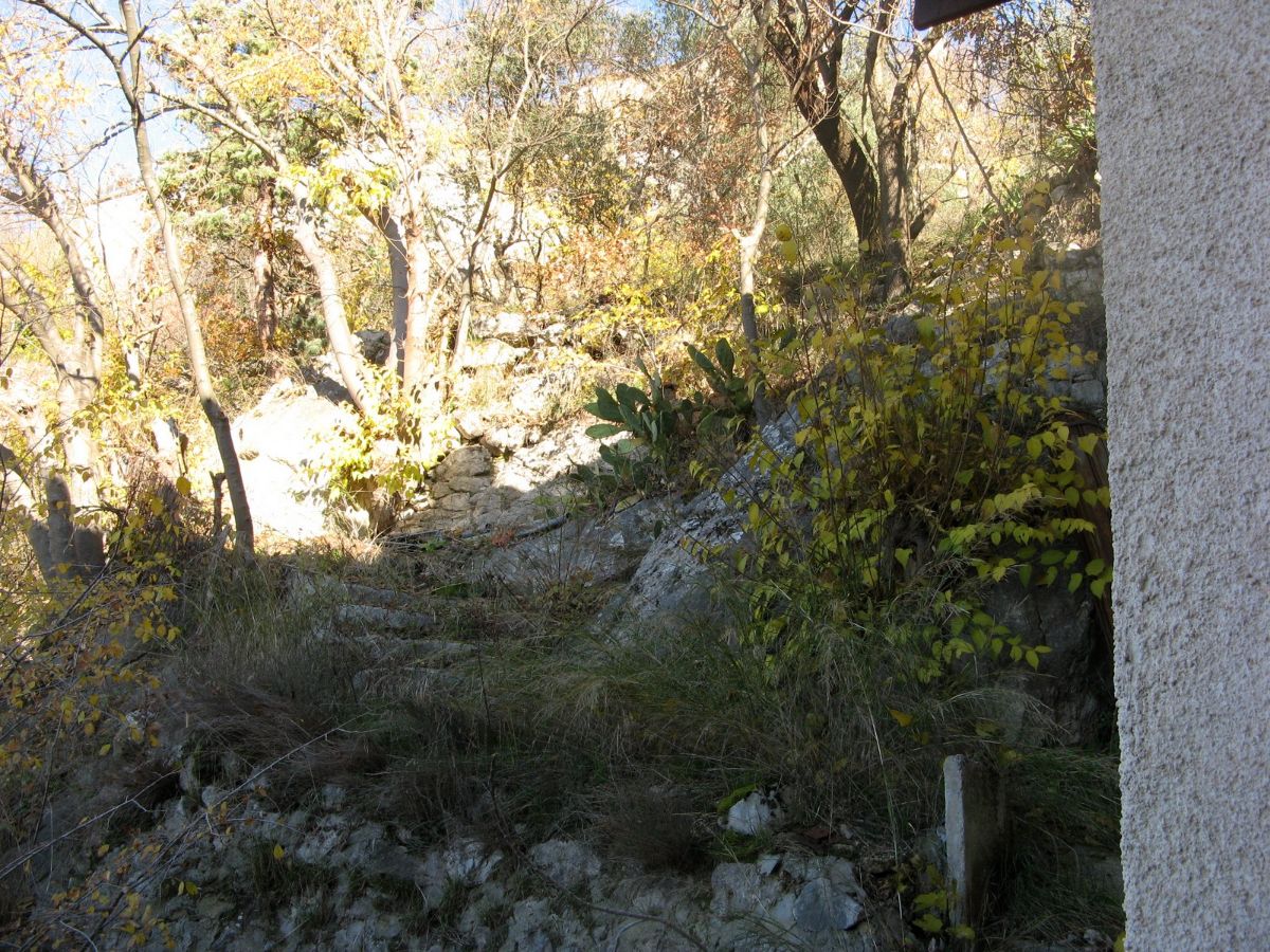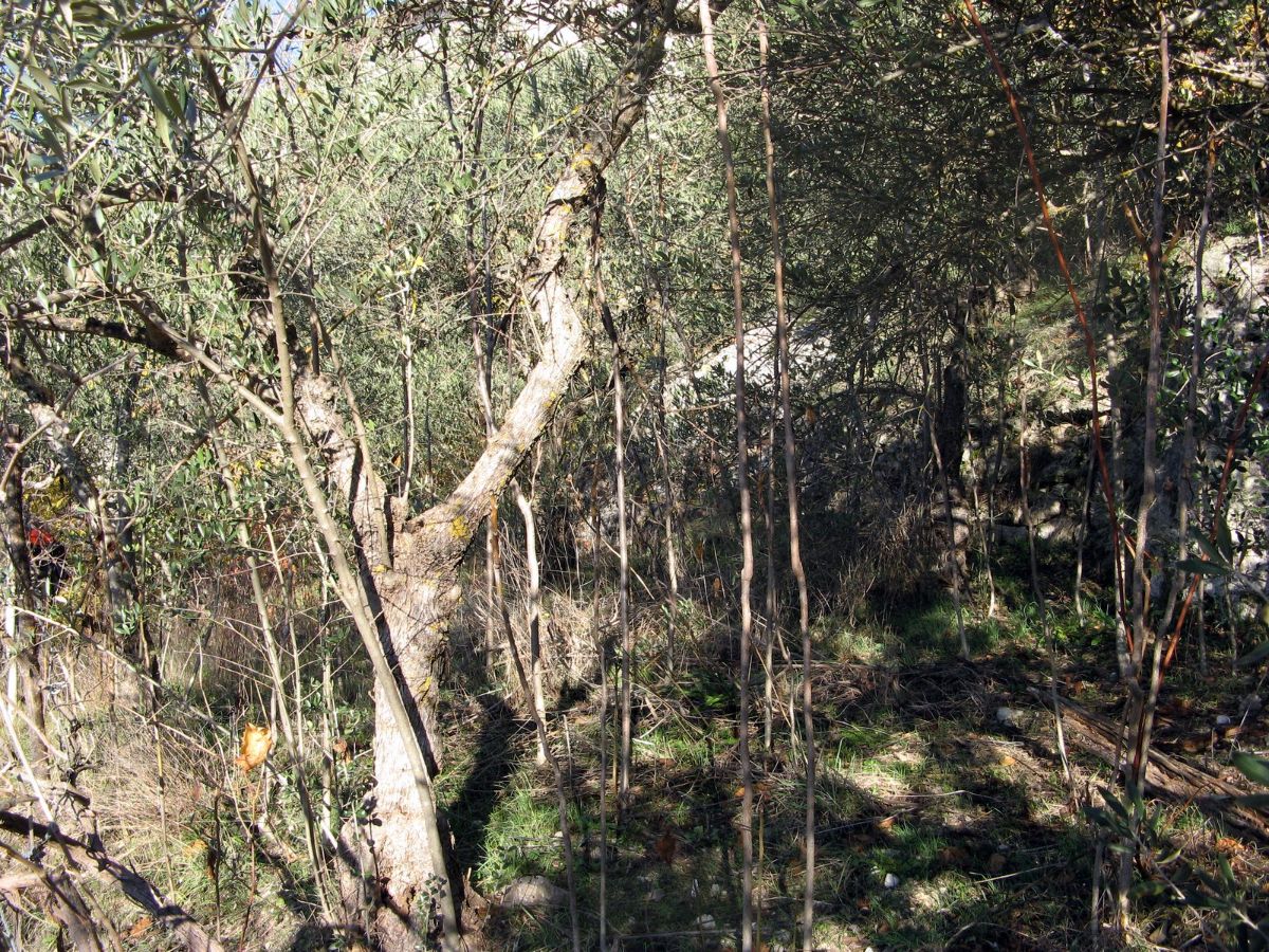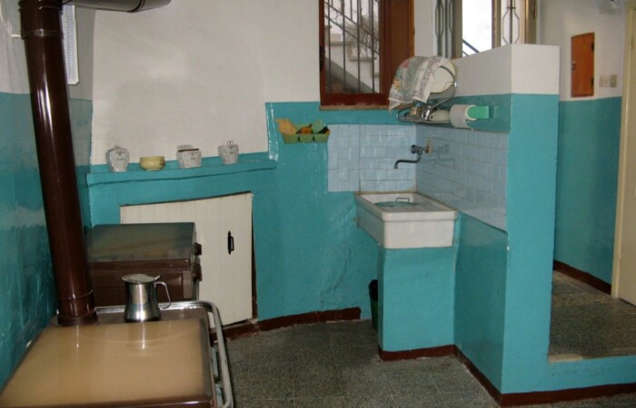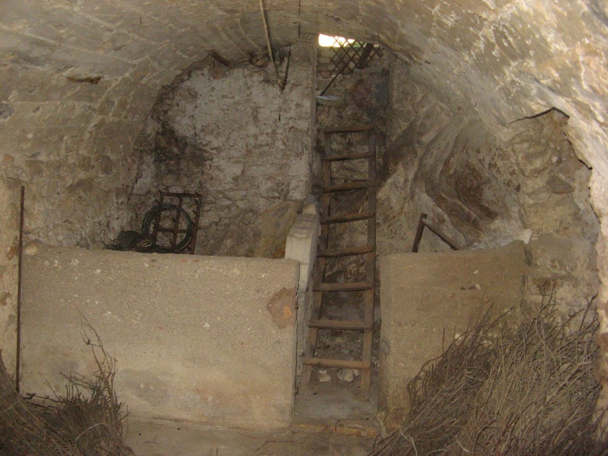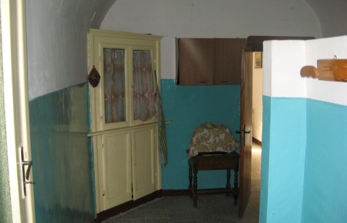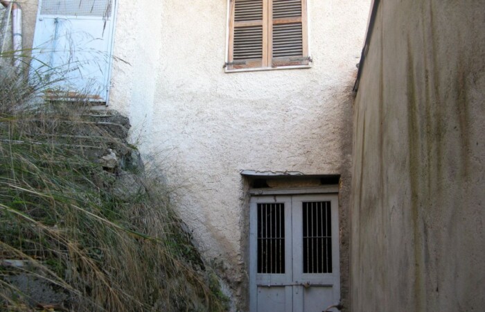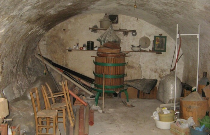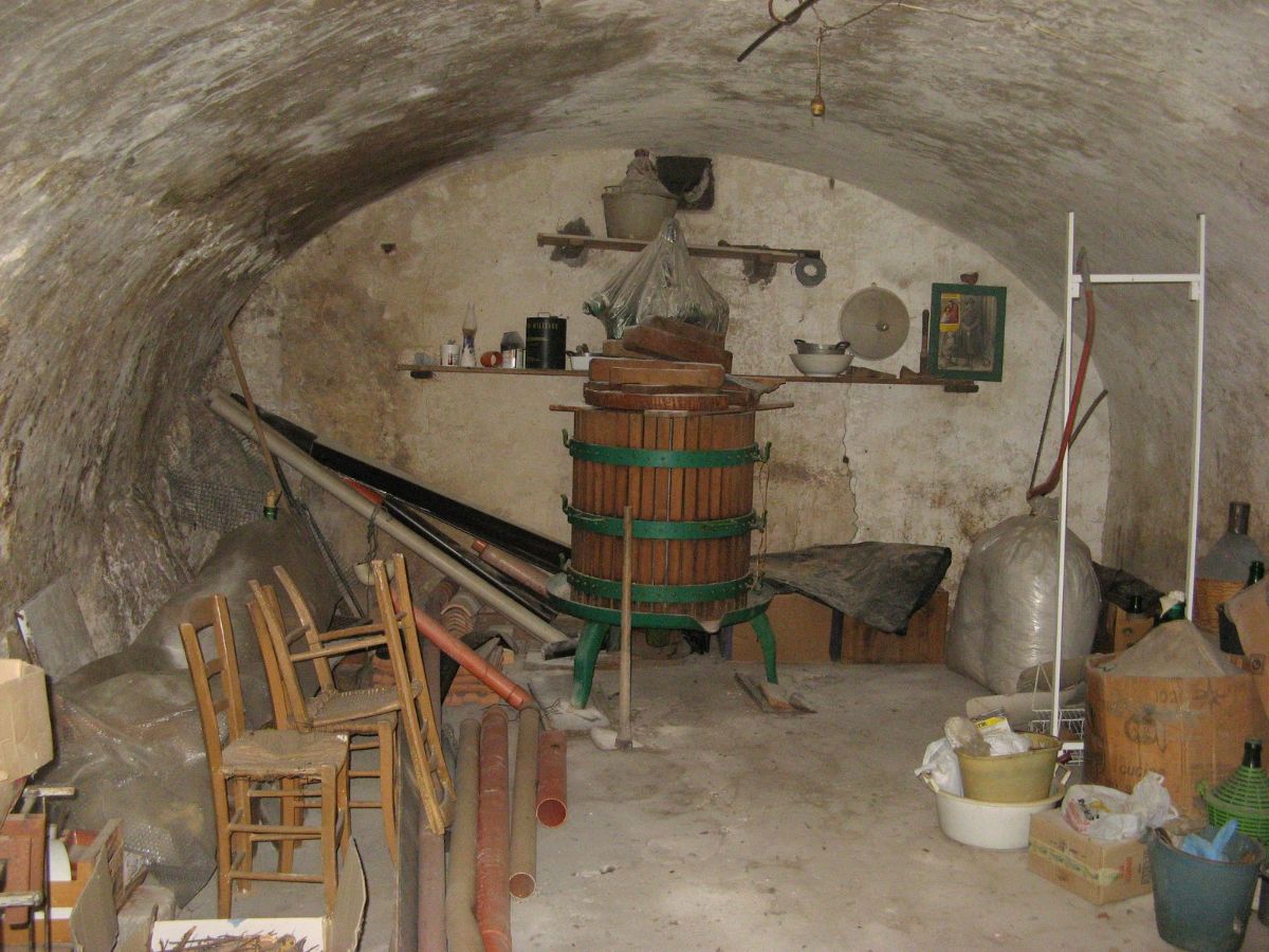 Il magazzino/garage di 15 mq è dotato di serranda metallica e posteriormente ha una porta verso l’esterno dove una scaletta in muratura consente di scendere verso una interessante cantina con volta a botte o salire verso un terreno di circa 800 mq. in leggera pendenza, sovrastante la casa con alcuni olivi ed un piccolo vigneto (da riattivare), detenuti per possesso da lungo tempo.