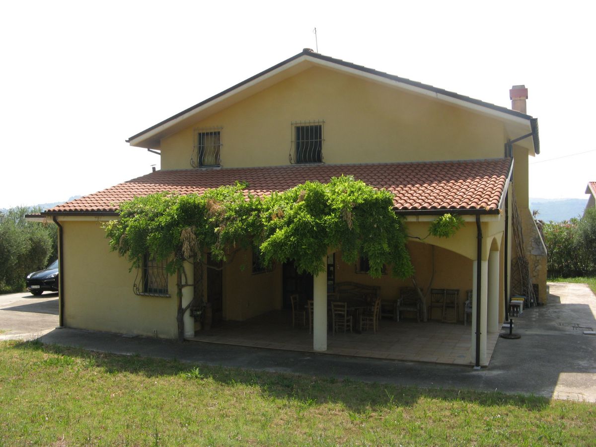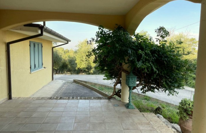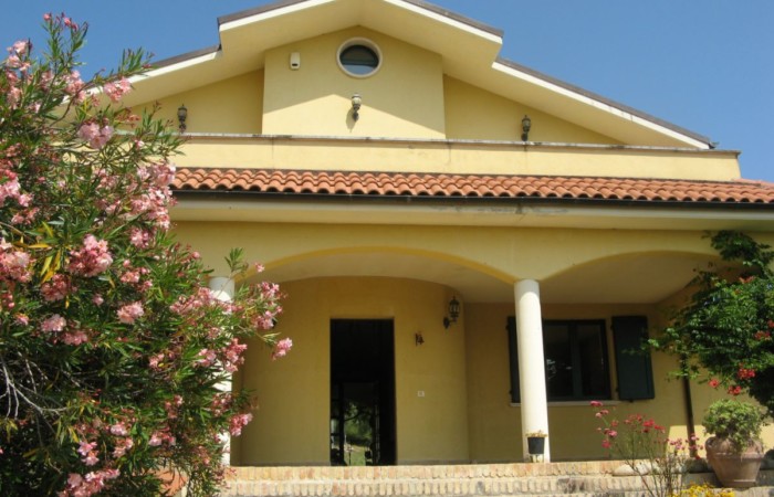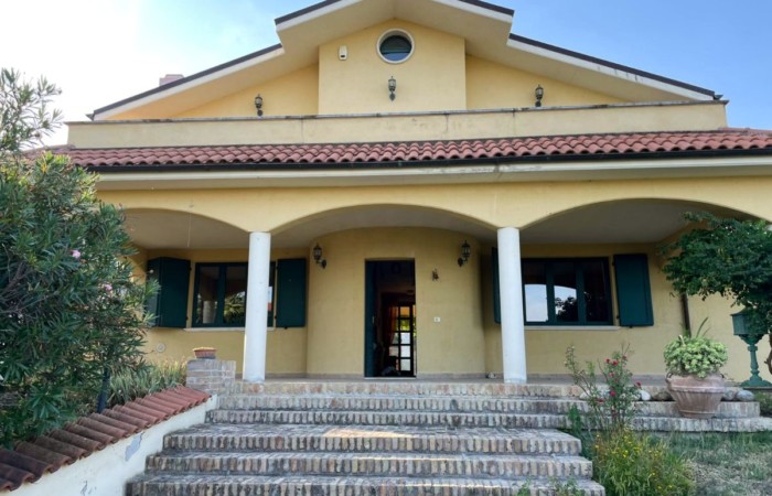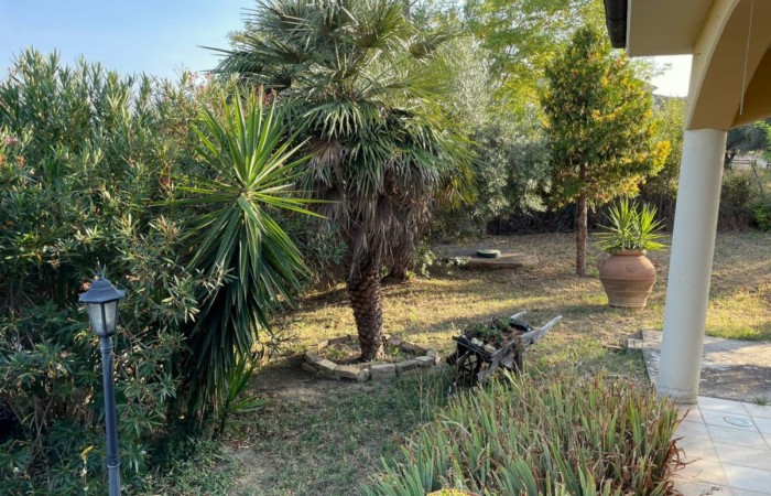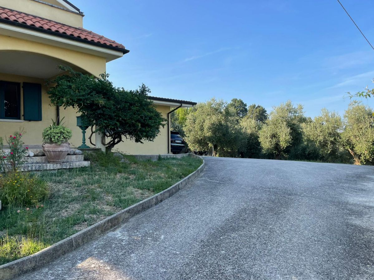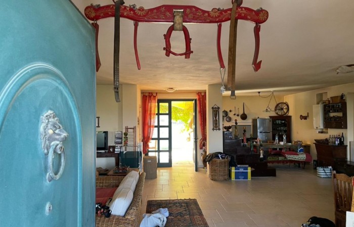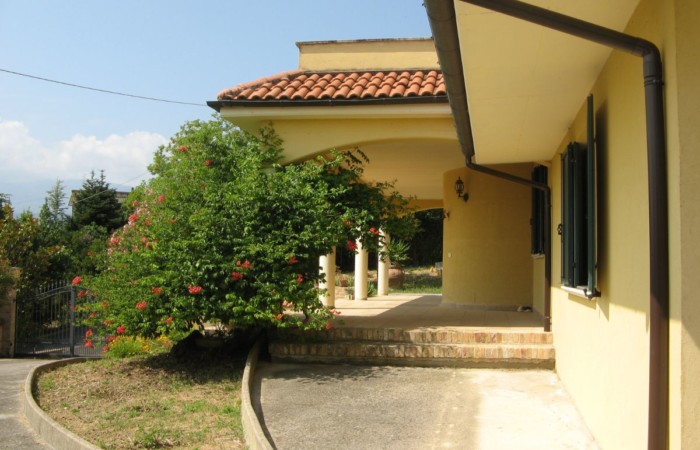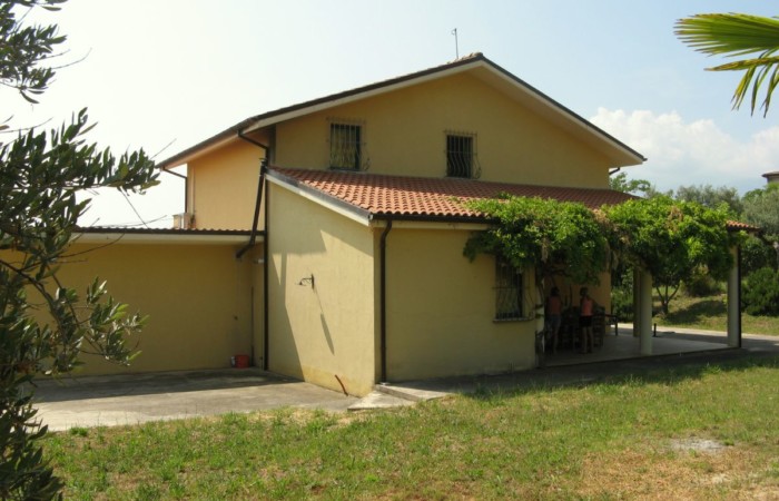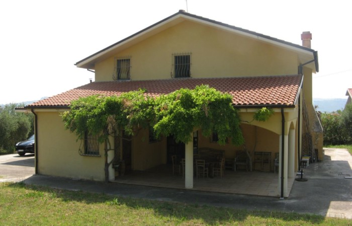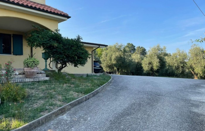 Villa di tre livelli (circa 250 mq.l.) costruita in cemento armato negli anni tra il 2001 e il 2007 su un pianoro di un leggero pendio in posizione molto panoramica. Sono presenti 4 camere da letto, 2 bagni, cucina, grande soggiorno, 2 portici e grande terrazzo a poche centinaia di metri dal centro del paese e con tutti i servizi nei pressi. La villa è circondata da un terreno di circa 8.000 mq. con 160 olivi altamente produttivi, diverse piante ornamentali e alberi da frutta. Si accede alla proprietà tramite un cancello carrabile automatico affiancato da uno pedonale sulla via comunale asfaltata e con una breve salita si raggiunge l’area parcheggio. La facciata anteriore est della villa presenta un elegante portico pavimentato al piano terra sovrastato dal terrazzo del primo piano e quindi dal timpano del sottotetto. Entrando ci si trova in un grande spazio aperto su livelli leggermente sfalsati in cui trovano posto due aree soggiorno con un grande camino a parete sullo sfondo di una impressionante rappresentazione pittorica in cui interagiscono personaggi classici. Completano il piano terra una attrezzata cucina ugualmente aperta verso il soggiorno ed un bagno. Tramite una porta posteriore si può uscire in un ulteriore portico ovest fronteggiato da un prato erboso con un pozzo (profondo 32 m.) ed in cui potrebbe trovar posto anche una piscina. Dal soggiorno, tramite una comoda scala interna in marmo si raggiunge il primo piano dove si succedono due ampie camere da letto, una cameretta ed un bagno ben organizzato; tutte le camere affacciano sul grande terrazzo da cui si gode una splendida vista del territorio circostante. Una scala a chiocciola porta ad un sottotetto parzialmente abitabile in cui può essere prevista una ulteriore camera da letto.