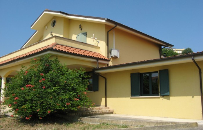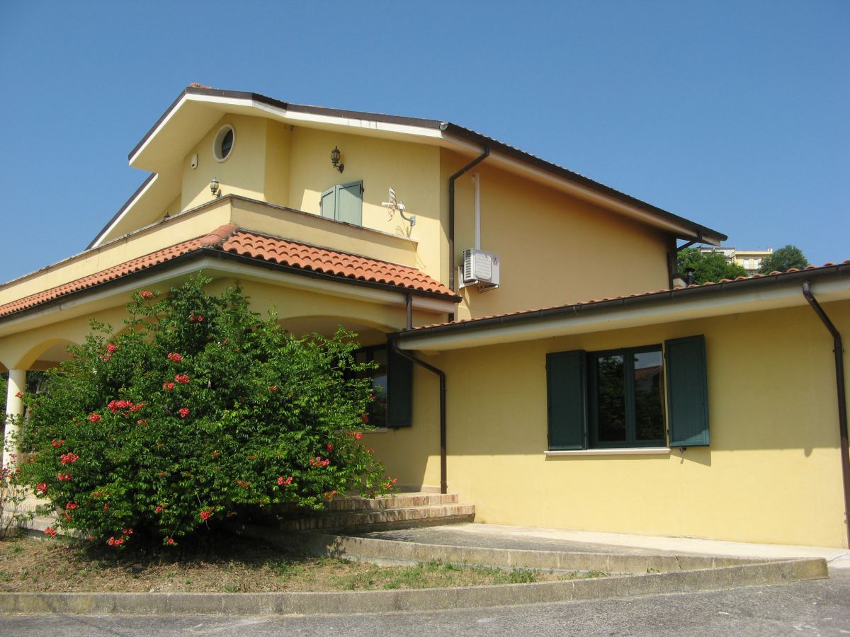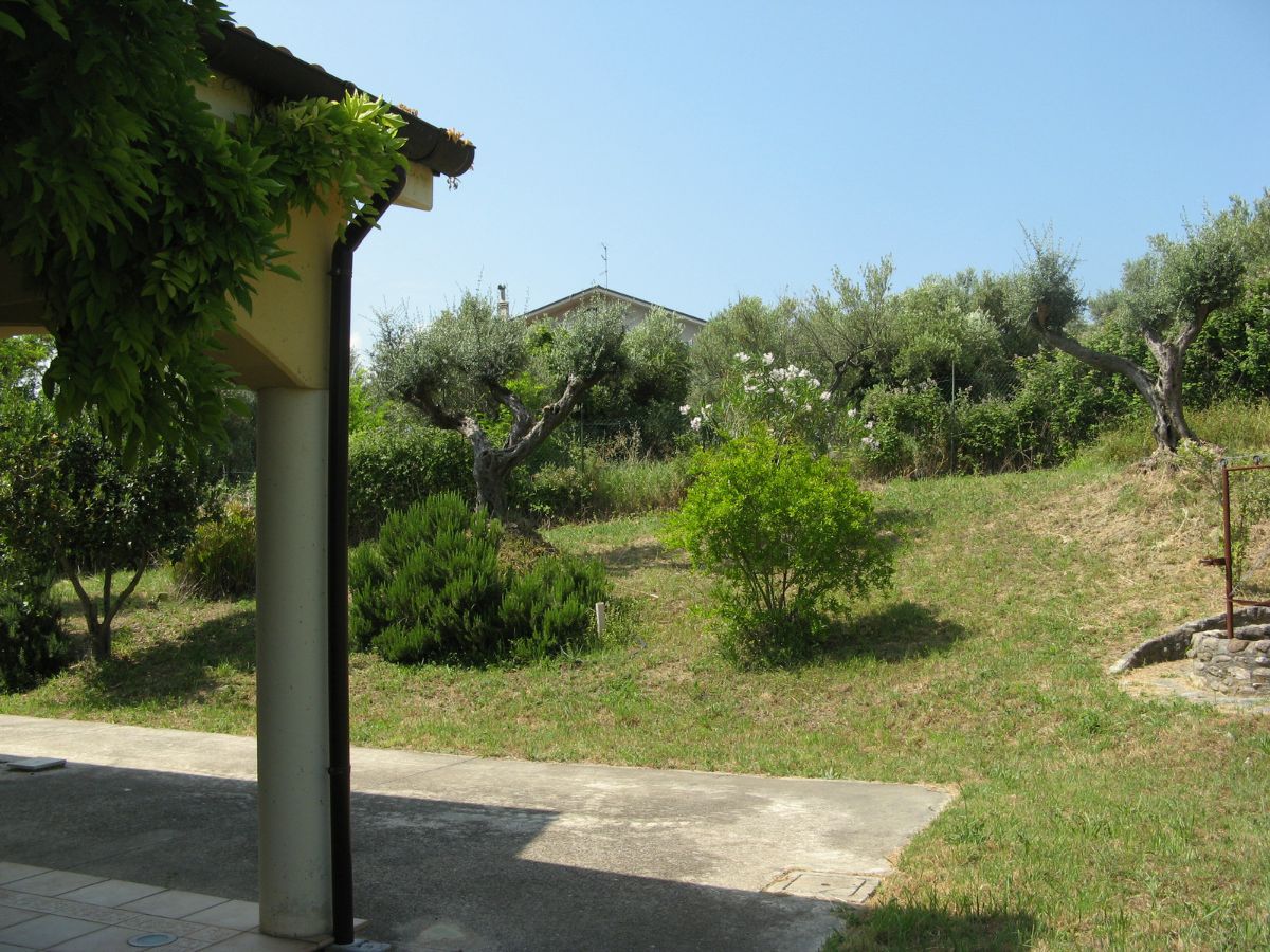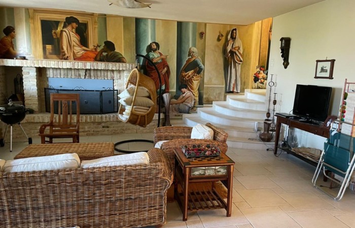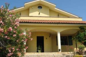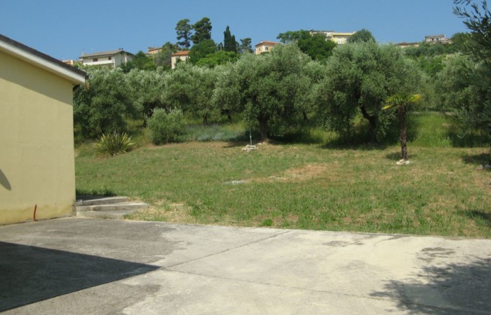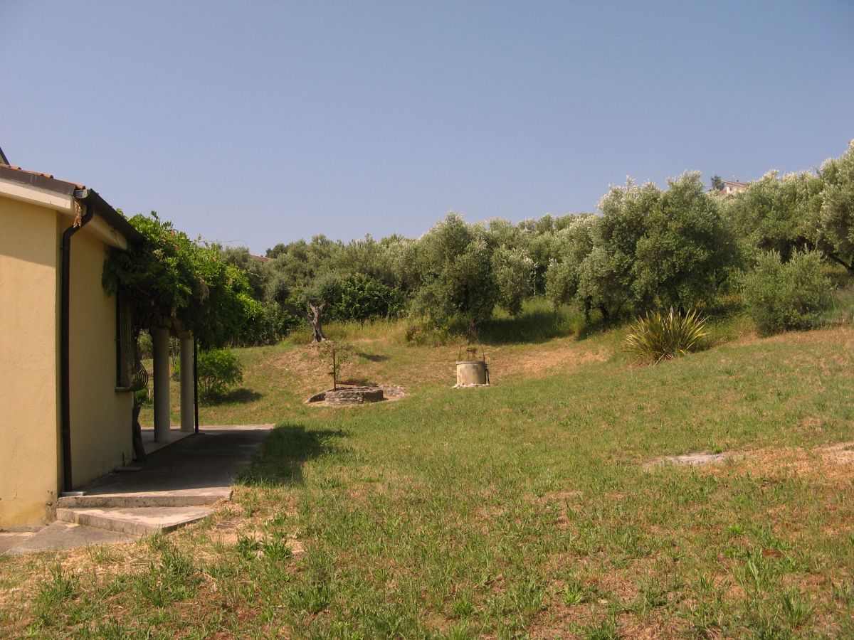 Villa di tre livelli (circa 250 mq.l.) costruita in cemento armato negli anni tra il 2001 e il 2007 su un pianoro di un leggero pendio in posizione molto panoramica. Sono presenti 4 camere da letto, 2 bagni, cucina, grande soggiorno, 2 portici e grande terrazzo a poche centinaia di metri dal centro del paese e con tutti i servizi nei pressi. La villa è circondata da un terreno di circa 8.000 mq. con 160 olivi altamente produttivi, diverse piante ornamentali e alberi da frutta. Si accede alla proprietà tramite un cancello carrabile automatico affiancato da uno pedonale sulla via comunale asfaltata e con una breve salita si raggiunge l’area parcheggio. La facciata anteriore est della villa presenta un elegante portico pavimentato al piano terra sovrastato dal terrazzo del primo piano e quindi dal timpano del sottotetto. Entrando ci si trova in un grande spazio aperto su livelli leggermente sfalsati in cui trovano posto due aree soggiorno con un grande camino a parete sullo sfondo di una impressionante rappresentazione pittorica in cui interagiscono personaggi classici. Completano il piano terra una attrezzata cucina ugualmente aperta verso il soggiorno ed un bagno. Tramite una porta posteriore si può uscire in un ulteriore portico ovest fronteggiato da un prato erboso con un pozzo (profondo 32 m.) ed in cui potrebbe trovar posto anche una piscina. Dal soggiorno, tramite una comoda scala interna in marmo si raggiunge il primo piano dove si succedono due ampie camere da letto, una cameretta ed un bagno ben organizzato; tutte le camere affacciano sul grande terrazzo da cui si gode una splendida vista del territorio circostante. Una scala a chiocciola porta ad un sottotetto parzialmente abitabile in cui può essere prevista una ulteriore camera da letto.