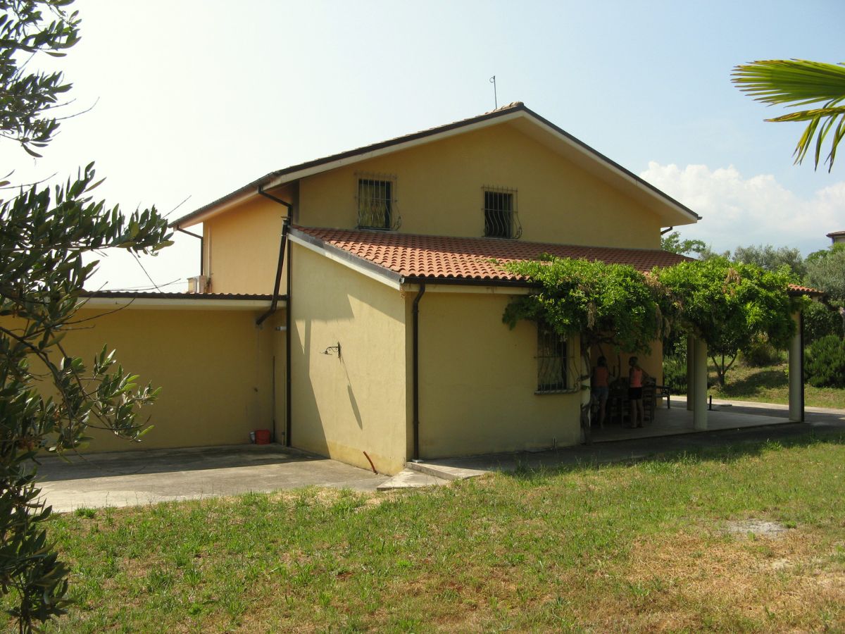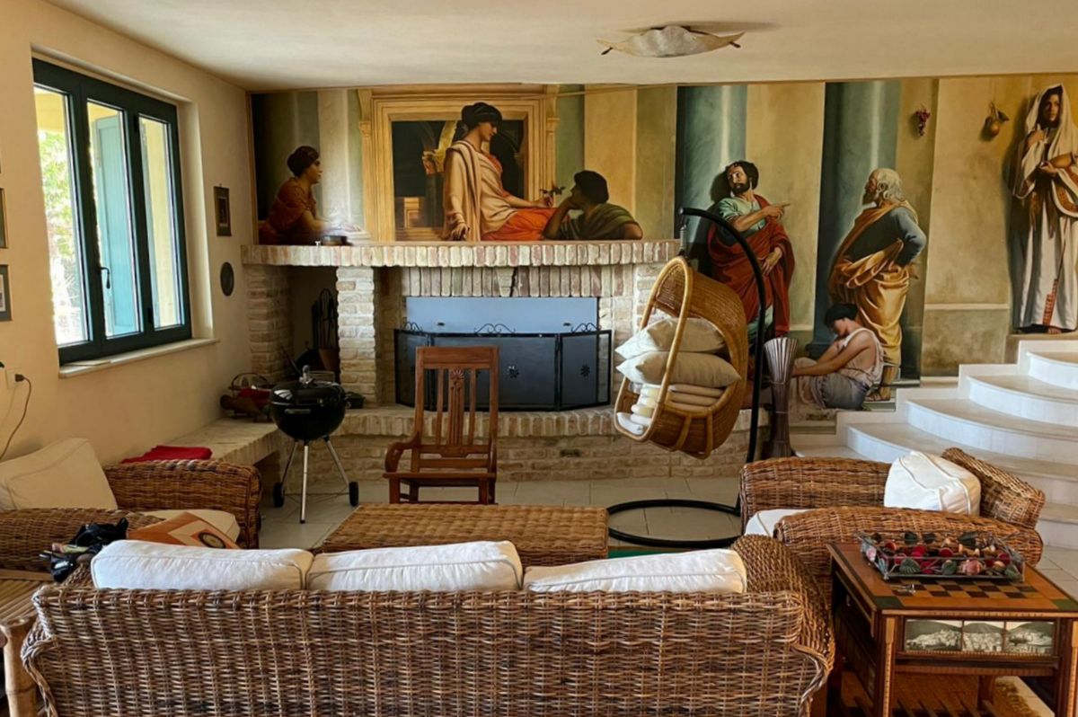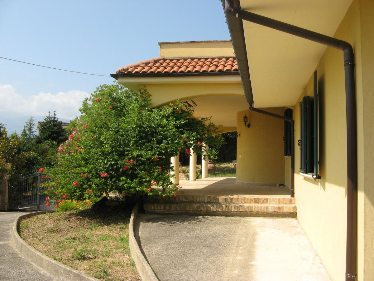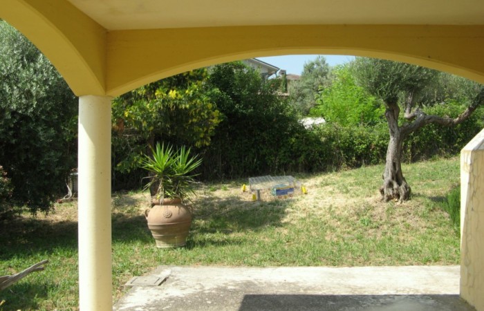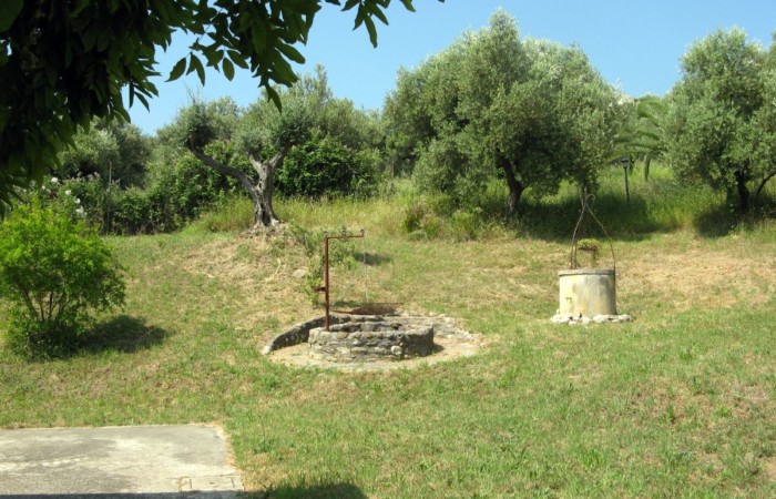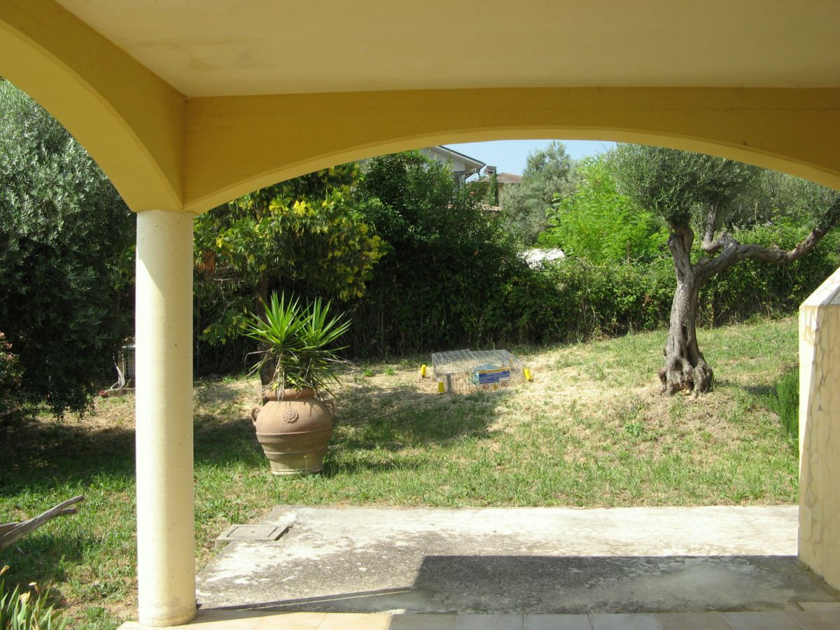 Villa di tre livelli (circa 250 mq.l.) costruita in cemento armato negli anni tra il 2001 e il 2007 su un pianoro di un leggero pendio in posizione molto panoramica. Sono presenti 4 camere da letto, 2 bagni, cucina, grande soggiorno, 2 portici e grande terrazzo a poche centinaia di metri dal centro del paese e con tutti i servizi nei pressi. La villa è circondata da un terreno di circa 8.000 mq. con 160 olivi altamente produttivi, diverse piante ornamentali e alberi da frutta. Si accede alla proprietà tramite un cancello carrabile automatico affiancato da uno pedonale sulla via comunale asfaltata e con una breve salita si raggiunge l’area parcheggio. La facciata anteriore est della villa presenta un elegante portico pavimentato al piano terra sovrastato dal terrazzo del primo piano e quindi dal timpano del sottotetto. Entrando ci si trova in un grande spazio aperto su livelli leggermente sfalsati in cui trovano posto due aree soggiorno con un grande camino a parete sullo sfondo di una impressionante rappresentazione pittorica in cui interagiscono personaggi classici. Completano il piano terra una attrezzata cucina ugualmente aperta verso il soggiorno ed un bagno. Tramite una porta posteriore si può uscire in un ulteriore portico ovest fronteggiato da un prato erboso con un pozzo (profondo 32 m.) ed in cui potrebbe trovar posto anche una piscina. Dal soggiorno, tramite una comoda scala interna in marmo si raggiunge il primo piano dove si succedono due ampie camere da letto, una cameretta ed un bagno ben organizzato; tutte le camere affacciano sul grande terrazzo da cui si gode una splendida vista del territorio circostante. Una scala a chiocciola porta ad un sottotetto parzialmente abitabile in cui può essere prevista una ulteriore camera da letto.