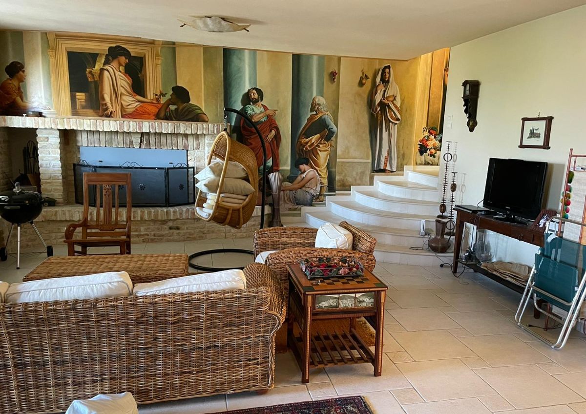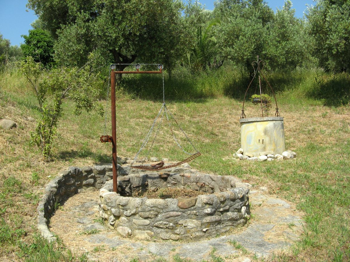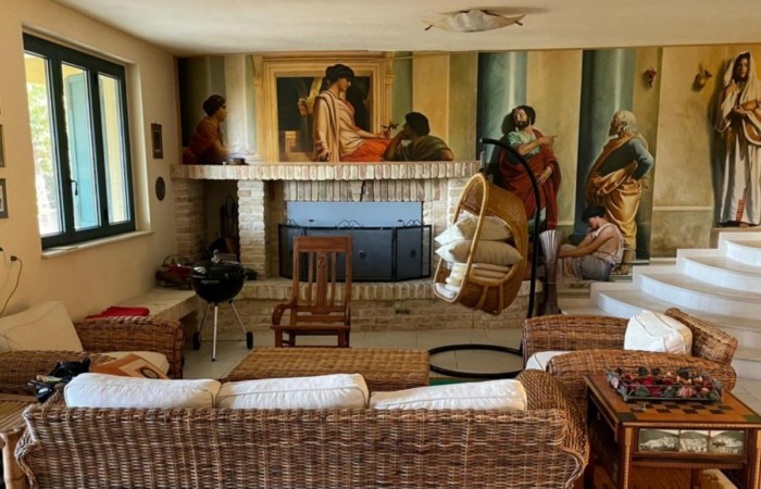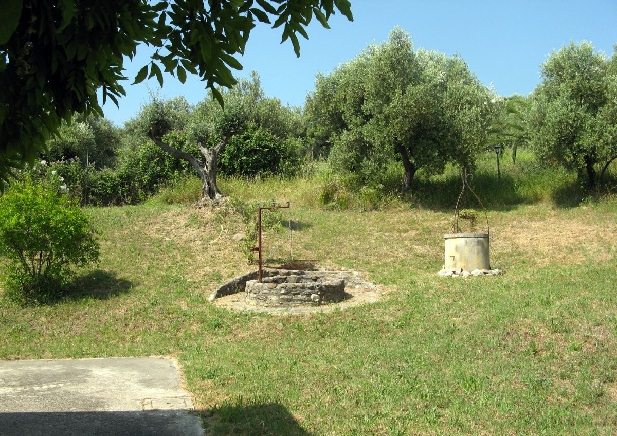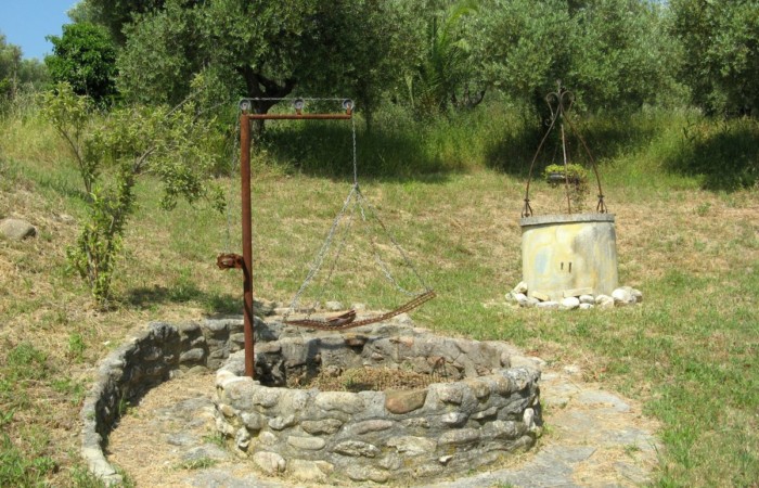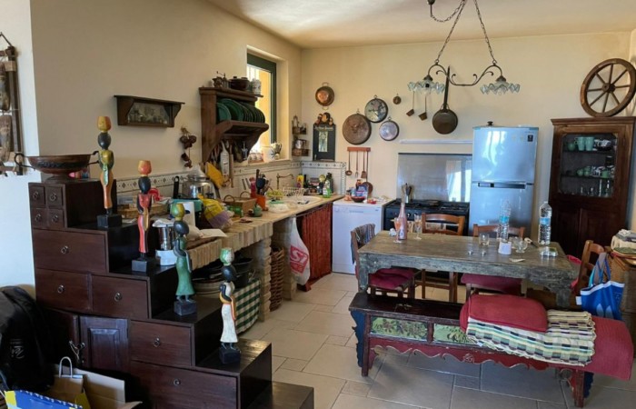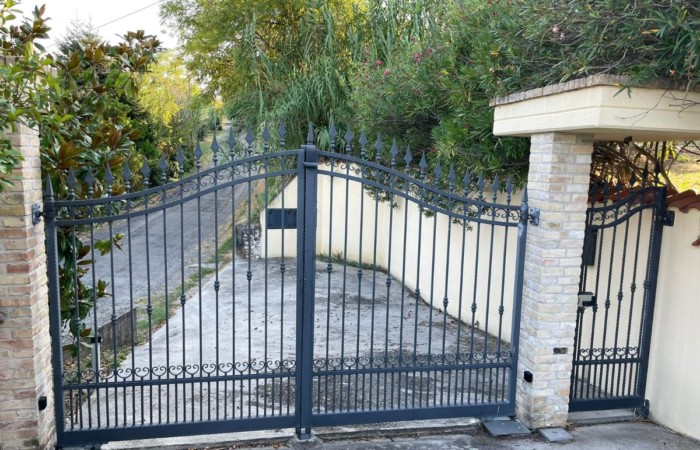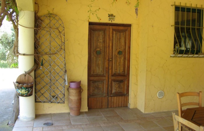 Villa di tre livelli (circa 250 mq.l.) costruita in cemento armato negli anni tra il 2001 e il 2007 su un pianoro di un leggero pendio in posizione molto panoramica. Sono presenti 4 camere da letto, 2 bagni, cucina, grande soggiorno, 2 portici e grande terrazzo a poche centinaia di metri dal centro del paese e con tutti i servizi nei pressi. La villa è circondata da un terreno di circa 8.000 mq. con 160 olivi altamente produttivi, diverse piante ornamentali e alberi da frutta. Si accede alla proprietà tramite un cancello carrabile automatico affiancato da uno pedonale sulla via comunale asfaltata e con una breve salita si raggiunge l’area parcheggio. La facciata anteriore est della villa presenta un elegante portico pavimentato al piano terra sovrastato dal terrazzo del primo piano e quindi dal timpano del sottotetto. Entrando ci si trova in un grande spazio aperto su livelli leggermente sfalsati in cui trovano posto due aree soggiorno con un grande camino a parete sullo sfondo di una impressionante rappresentazione pittorica in cui interagiscono personaggi classici. Completano il piano terra una attrezzata cucina ugualmente aperta verso il soggiorno ed un bagno. Tramite una porta posteriore si può uscire in un ulteriore portico ovest fronteggiato da un prato erboso con un pozzo (profondo 32 m.) ed in cui potrebbe trovar posto anche una piscina. Dal soggiorno, tramite una comoda scala interna in marmo si raggiunge il primo piano dove si succedono due ampie camere da letto, una cameretta ed un bagno ben organizzato; tutte le camere affacciano sul grande terrazzo da cui si gode una splendida vista del territorio circostante. Una scala a chiocciola porta ad un sottotetto parzialmente abitabile in cui può essere prevista una ulteriore camera da letto.