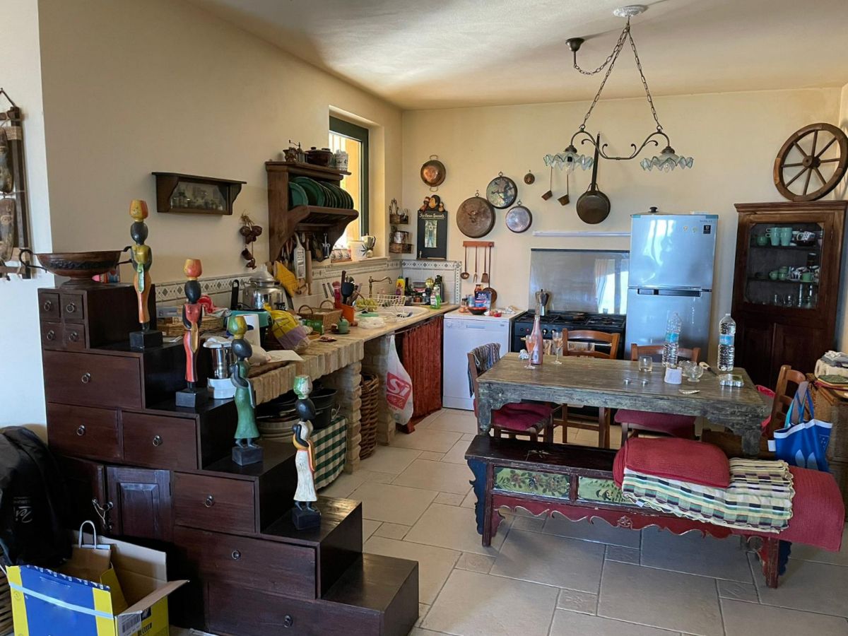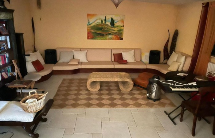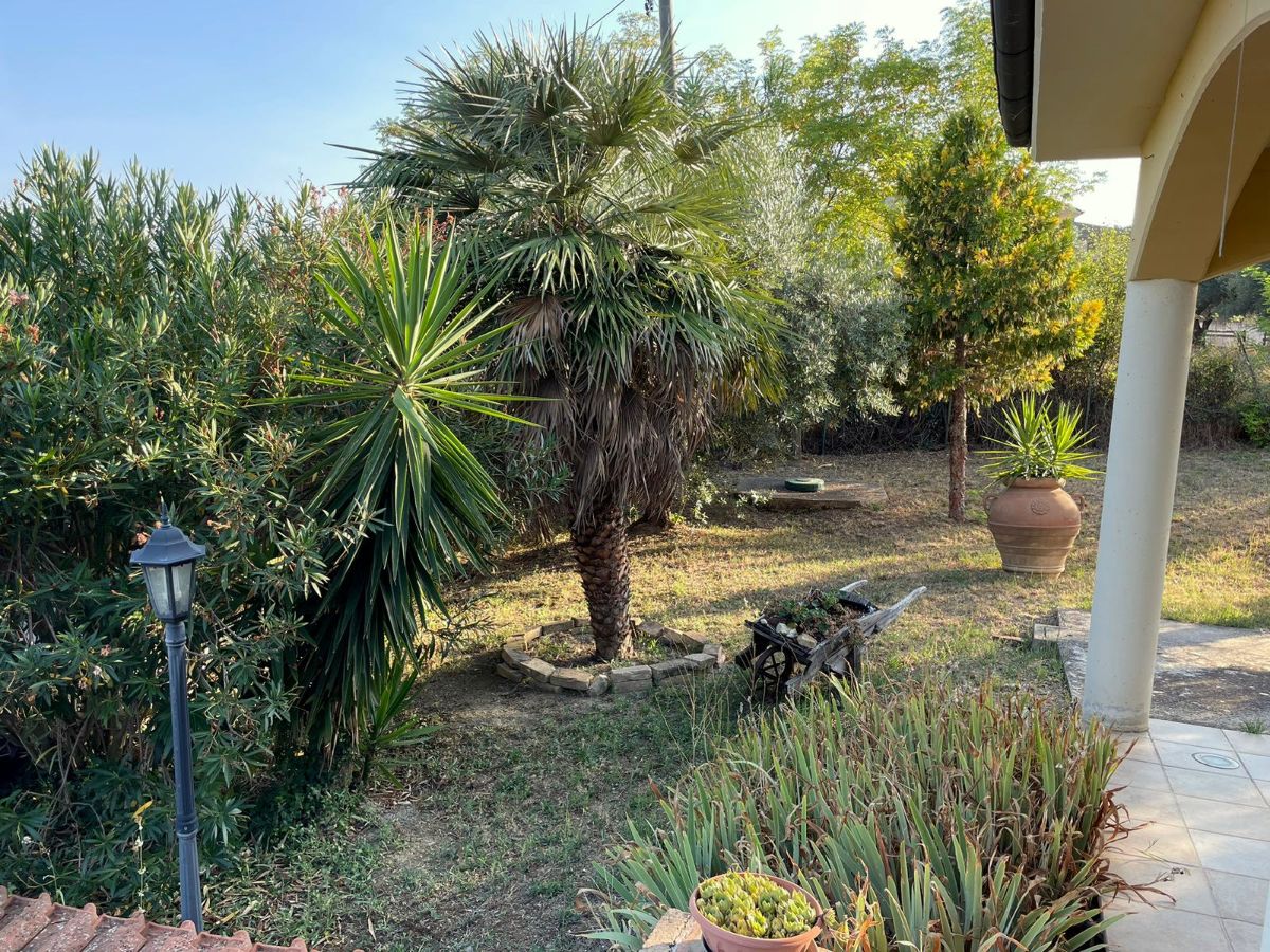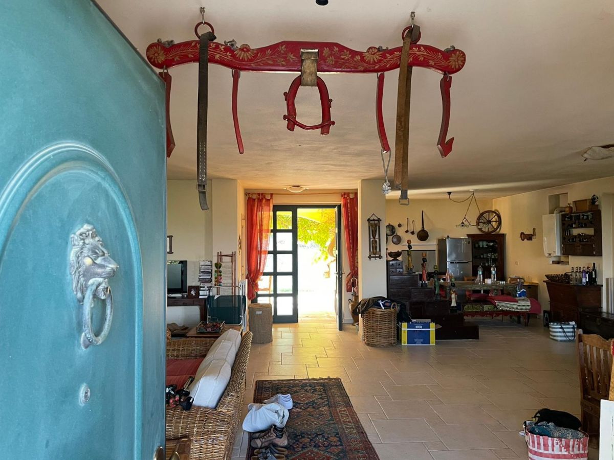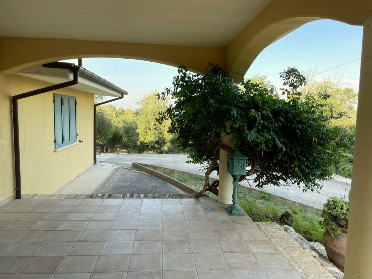 This three-level villa (approximately 250 sq m) was built in reinforced concrete between 2001 and 2007 on a gently sloping plateau in a very panoramic position. It features four bedrooms, two bathrooms, a kitchen, a large living room, two porches, and a large terrace, just a few hundred meters from the town center and close to all amenities. The villa is surrounded by approximately 8,000 sq m of land with 160 highly productive olive trees, various ornamental plants, and fruit trees. The property is accessed via an automatic driveway gate, flanked by a pedestrian gate on the paved municipal road, and a short climb leads to the parking area. The front east façade of the villa features an elegant paved portico on the ground floor, overlooked by the first-floor terrace and then the attic gable. Upon entering, you find a large open space on slightly staggered levels, featuring two living areas with a large wall-mounted fireplace against the backdrop of an impressive painting of interacting classical figures. The ground floor is completed by a fully equipped kitchen, also open to the living room, and a bathroom. A rear door leads to an additional west-facing portico overlooking a grassy lawn with a well (32 meters deep), which could also accommodate a swimming pool. From the living room, a comfortable internal marble staircase leads to the first floor, where two large bedrooms, a single bedroom, and a well-appointed bathroom follow one another. All bedrooms open onto the large terrace, which offers splendid views of the surrounding area. A spiral staircase leads to a partially habitable attic space, which could be converted into an additional bedroom.