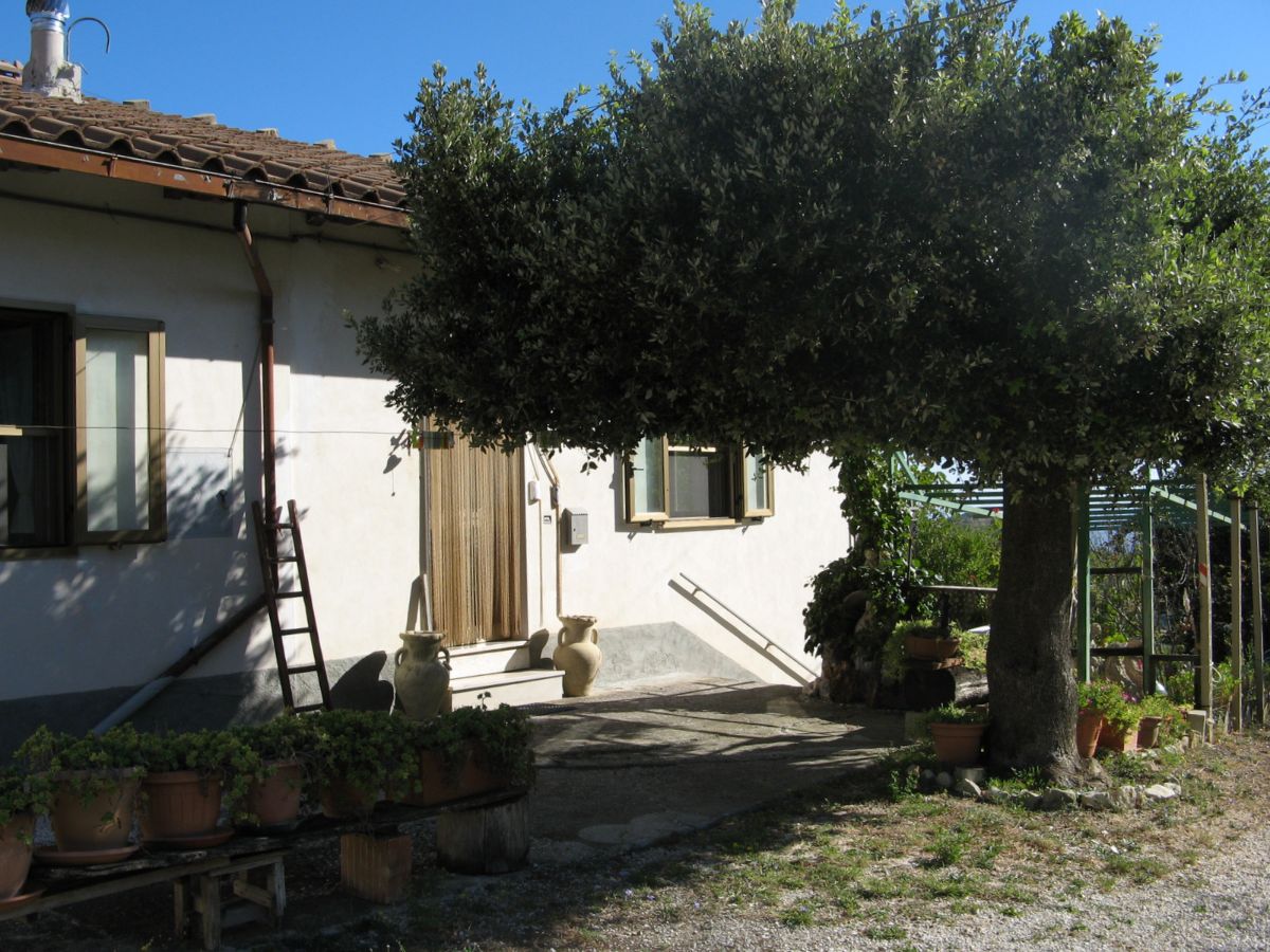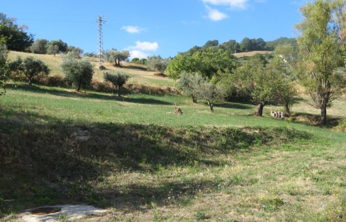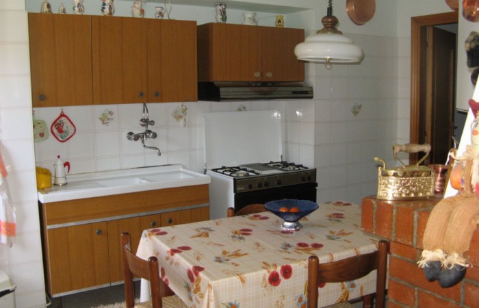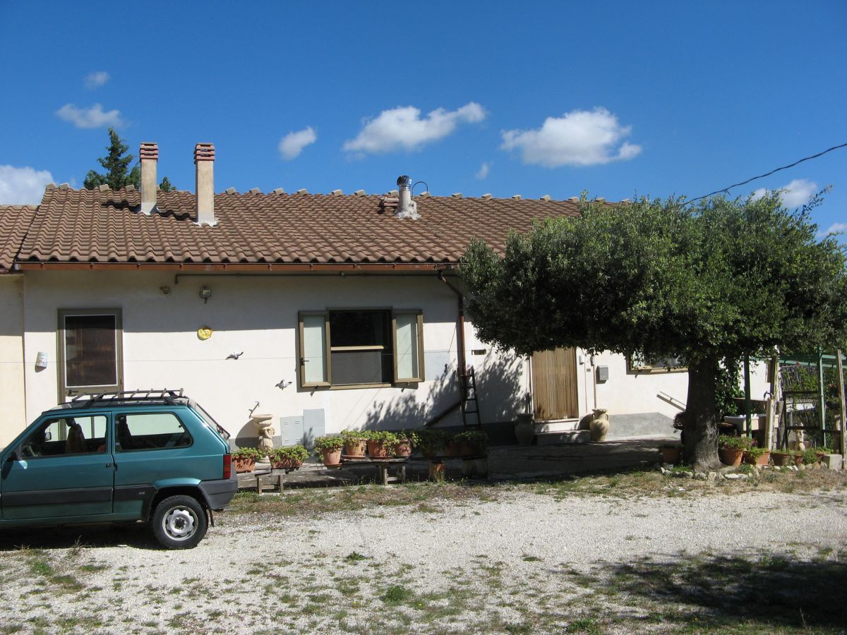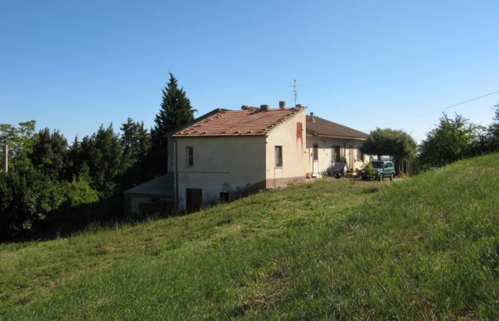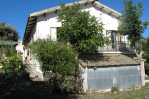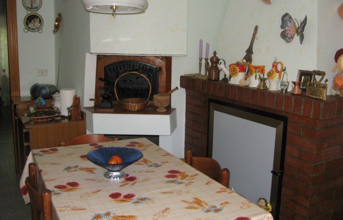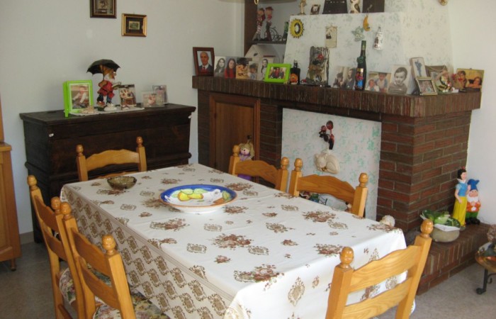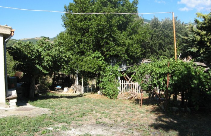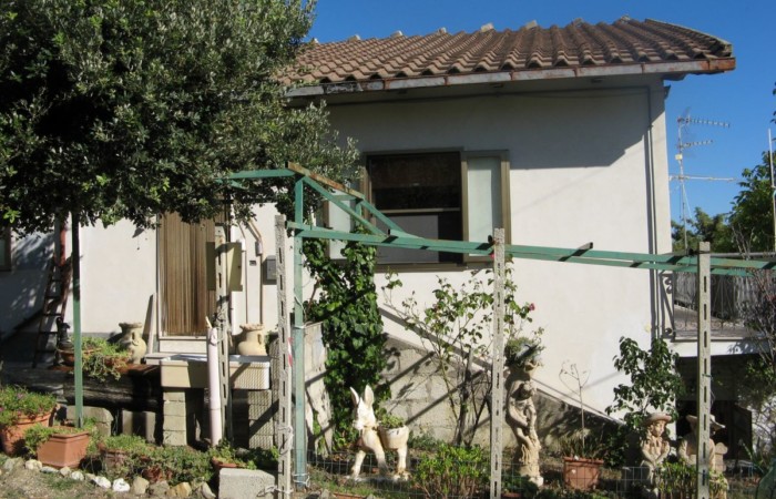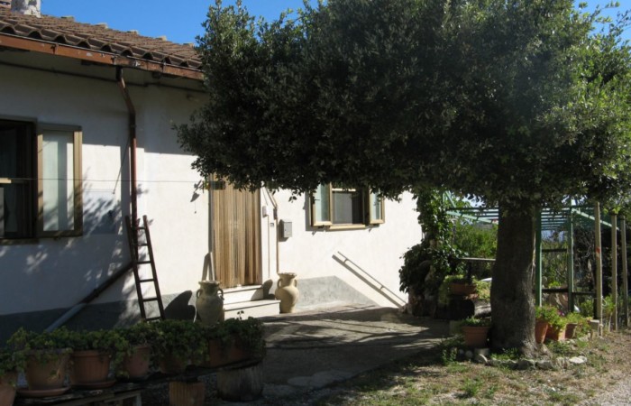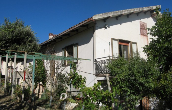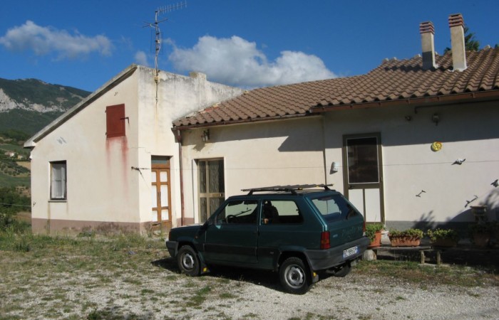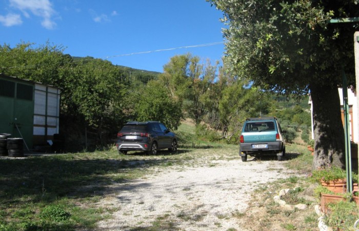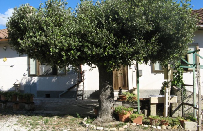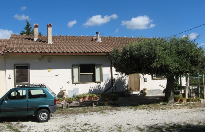 Casa di due livelli risultante dalla fusione di tre unità in schiera (200 mq.l.), ristrutturata ed ultimata nel 1990. La casa è disposta su un leggero pendio ed ha quindi il piano terra totalmente occupato dall’ abitazione (con 2 camere da letto ed 1 bagno) mentre il piano seminterrato è occupato da cantine e locali di servizio. Contigua alla casa è presente un’altra proprietà non abitata (eventualmente acquistabile da altro proprietario) che condivide la strada di accesso e la corte antistante l’ingresso. Davanti alla casa a valle un grande spazio recintato con diversi annessi e locali di utilità (146 mq). I terreni seminativi sono soprattutto alle spalle nel settore rialzato mentre inferiormente si estendono gli oliveti con 123 piante produttive (tot. 11.235 mq).