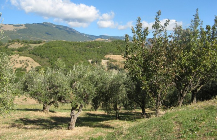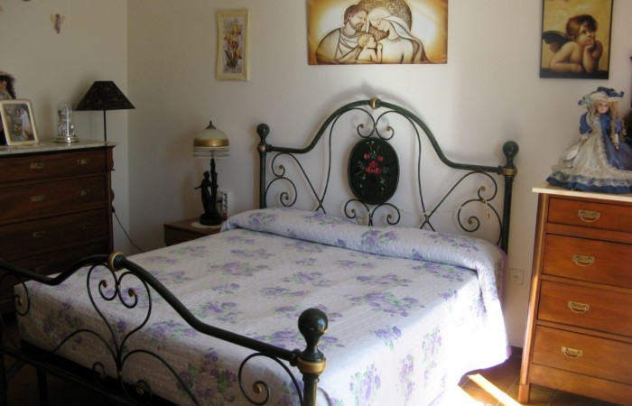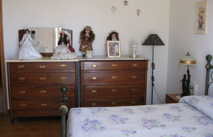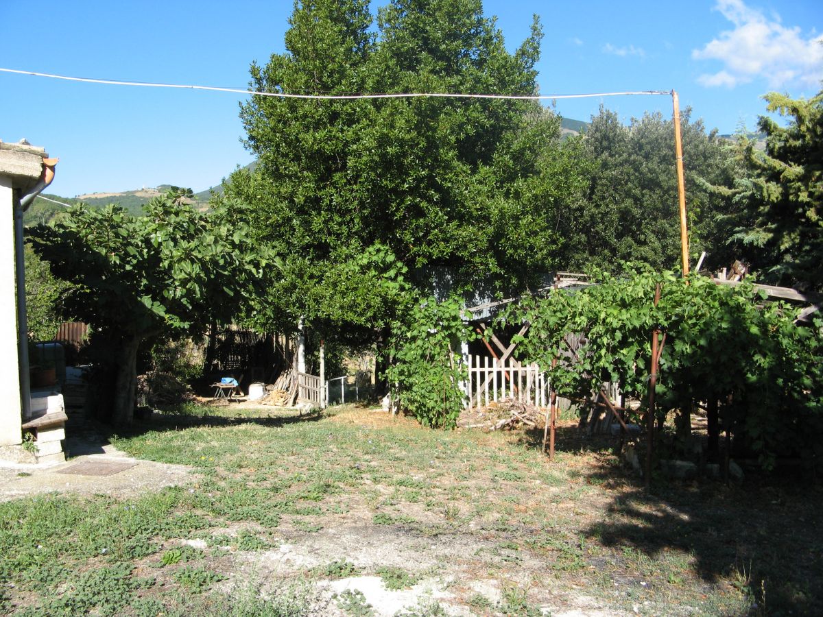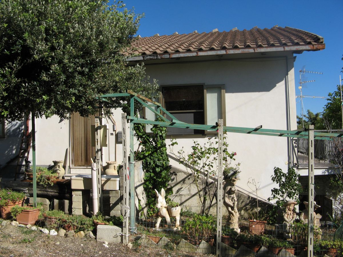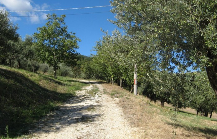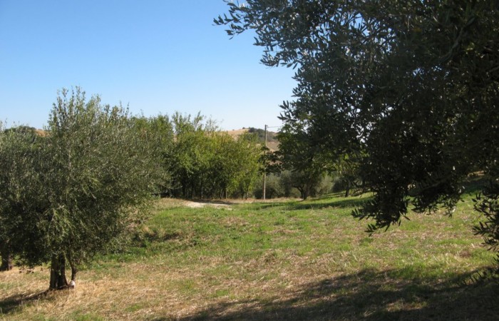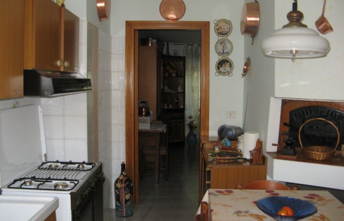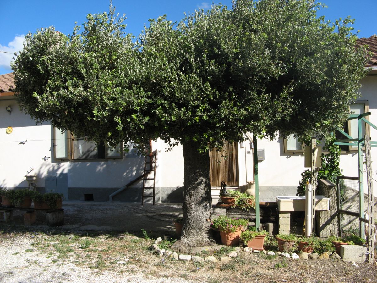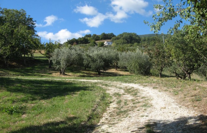 Casa di due livelli risultante dalla fusione di tre unità in schiera (200 mq.l.), ristrutturata ed ultimata nel 1990. La casa è disposta su un leggero pendio ed ha quindi il piano terra totalmente occupato dall’ abitazione (con 2 camere da letto ed 1 bagno) mentre il piano seminterrato è occupato da cantine e locali di servizio. Contigua alla casa è presente un’altra proprietà non abitata (eventualmente acquistabile da altro proprietario) che condivide la strada di accesso e la corte antistante l’ingresso. Davanti alla casa a valle un grande spazio recintato con diversi annessi e locali di utilità (146 mq). I terreni seminativi sono soprattutto alle spalle nel settore rialzato mentre inferiormente si estendono gli oliveti con 123 piante produttive (tot. 11.235 mq).