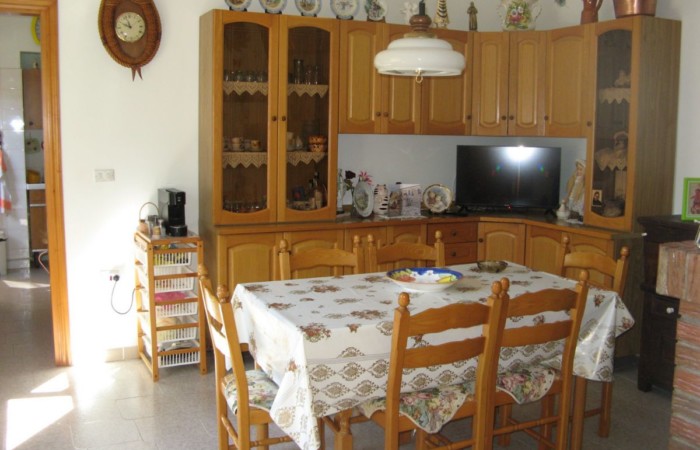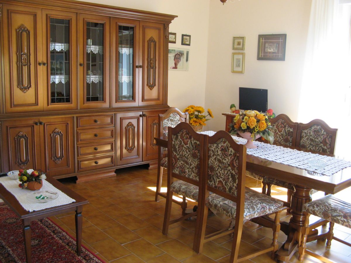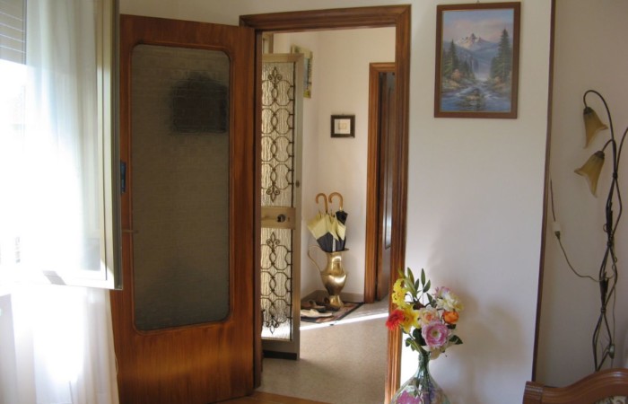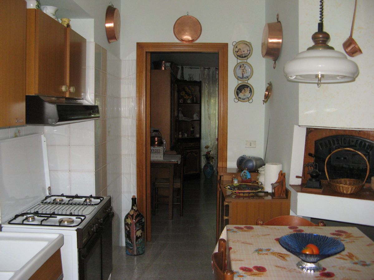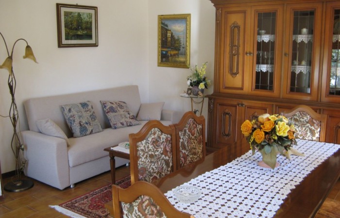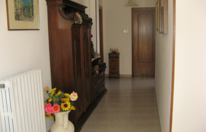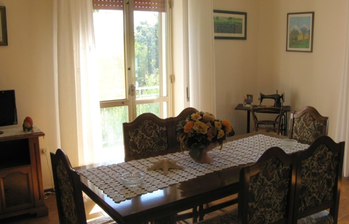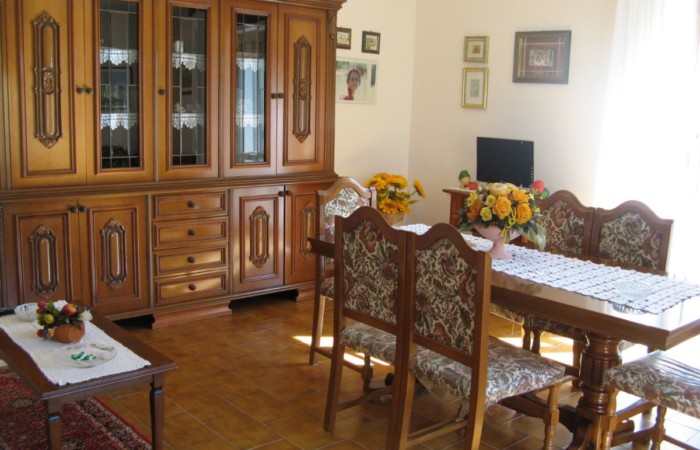 Al piano terra (100 mq.l.)si sviluppa una successione di stanze su due linee parallele, tutte collegate da un percorso circolare. Ci sono due ingressi, quello di destra immette in un corridoio che collega un ampio soggiorno ed una camera da letto che hanno entrambi porte/finestre con uscita su un lungo balcone abitabile da cui si gode una notevole vista panoramica. In fondo al corridoio presente un bagno con doccia. Dal corridoio si può entrare in una successione di tre stanze con funzione di sala da pranzo, e cucine. La cucina più a sinistra è attrezzata con forno e camino ed ha anche il secondo ingresso diretto dall’esterno. Proseguendo il percorso circolare si attraversano due camere da letto per uscire nuovamente sul corridoio di ingresso nei pressi del bagno.