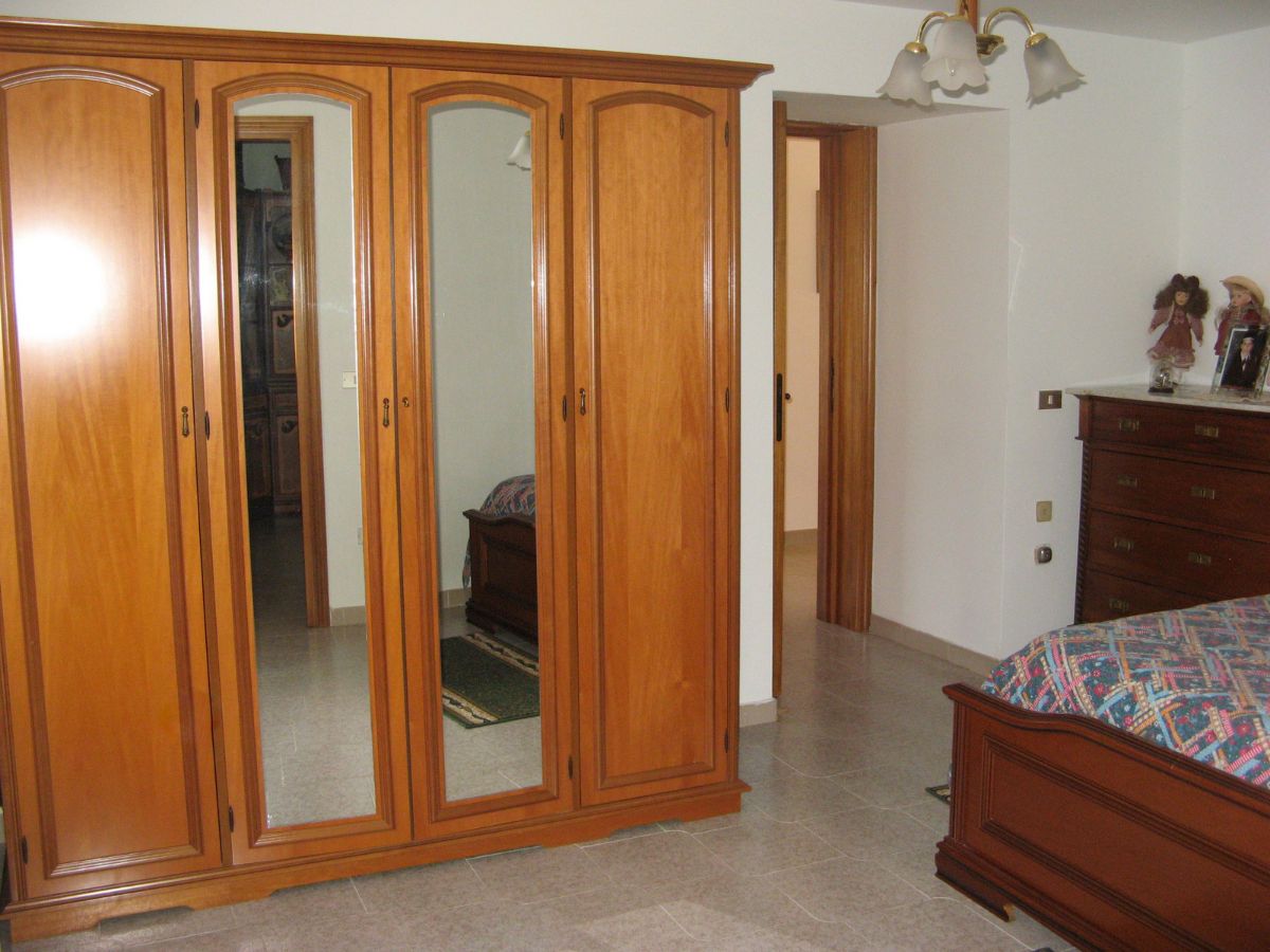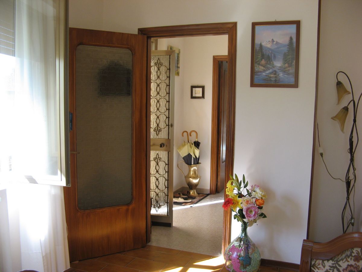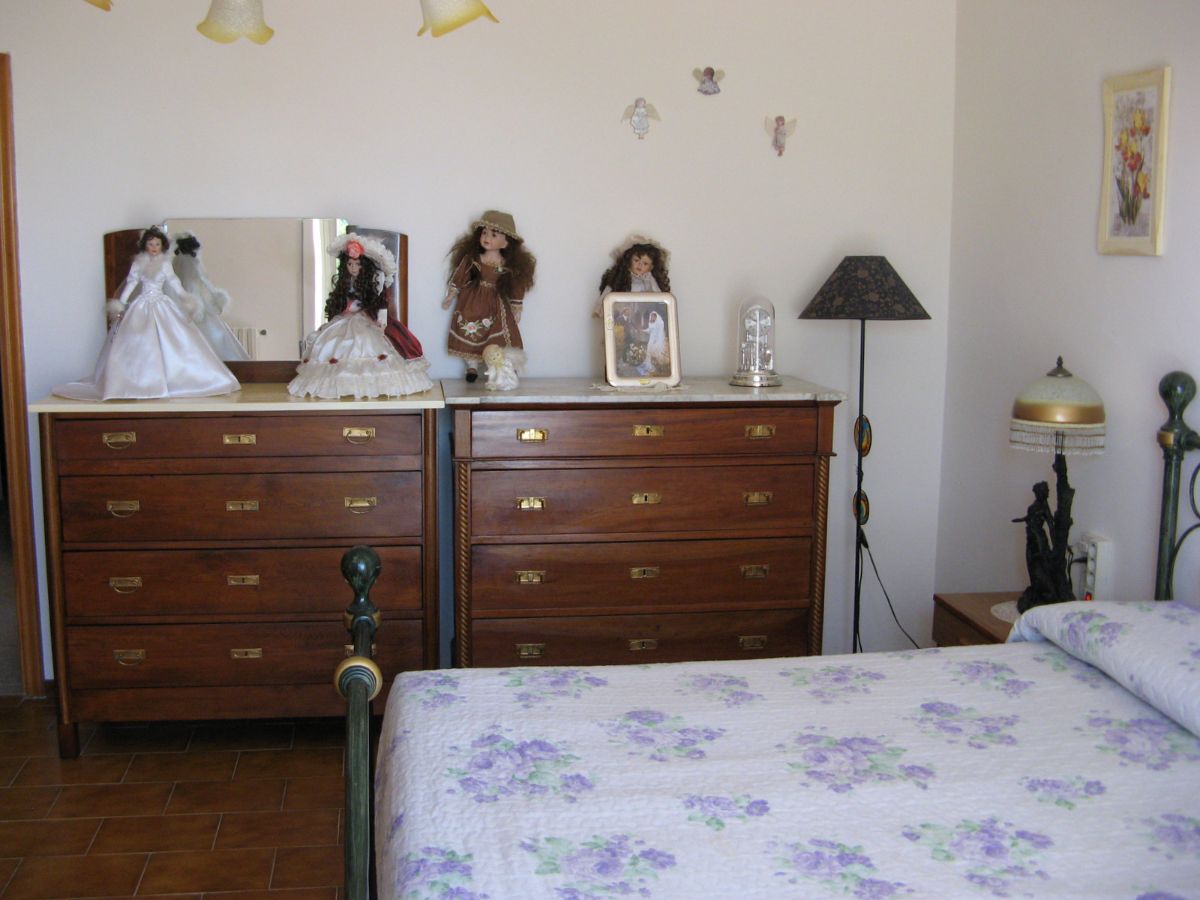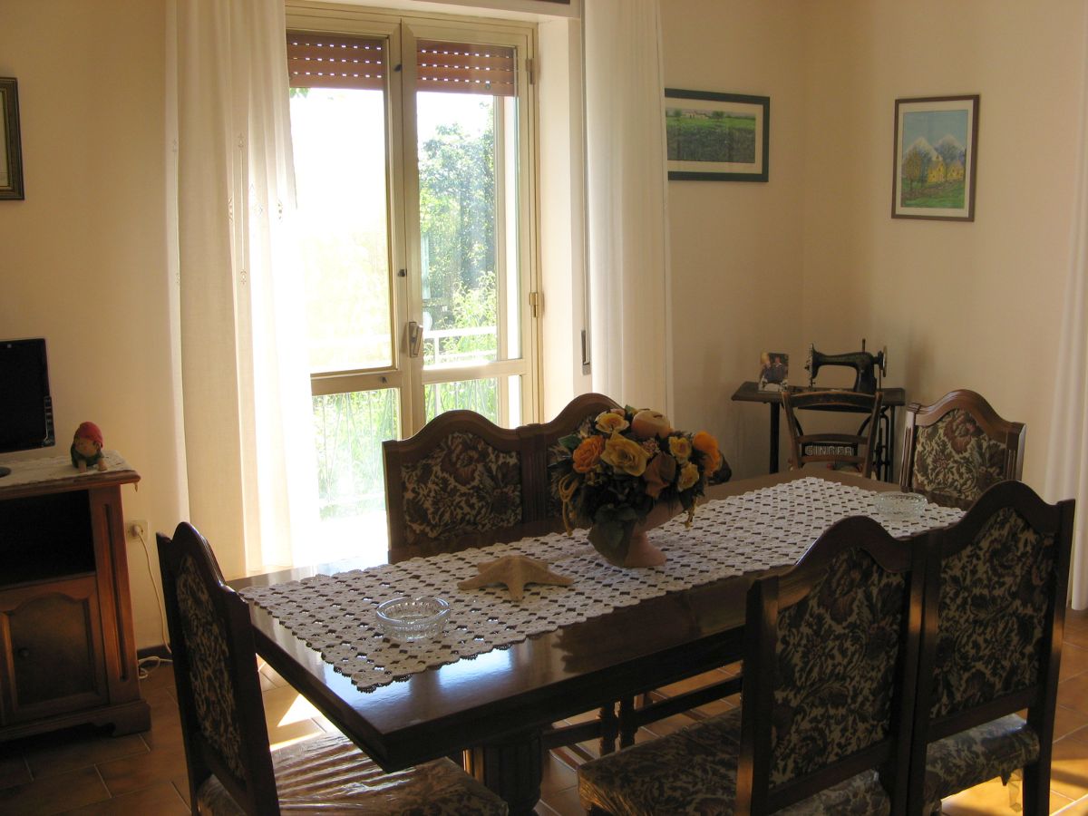Al piano terra (100 mq.l.)si sviluppa una successione di stanze su due linee parallele, tutte collegate da un percorso circolare. Ci sono due ingressi, quello di destra immette in un corridoio che collega un ampio soggiorno ed una camera da letto che hanno entrambi porte/finestre con uscita su un lungo balcone abitabile da cui si gode una notevole vista panoramica. In fondo al corridoio presente un bagno con doccia. Dal corridoio si può entrare in una successione di tre stanze con funzione di sala da pranzo, e cucine. La cucina più a sinistra è attrezzata con forno e camino ed ha anche il secondo ingresso diretto dall’esterno. Proseguendo il percorso circolare si attraversano due camere da letto per uscire nuovamente sul corridoio di ingresso nei pressi del bagno.