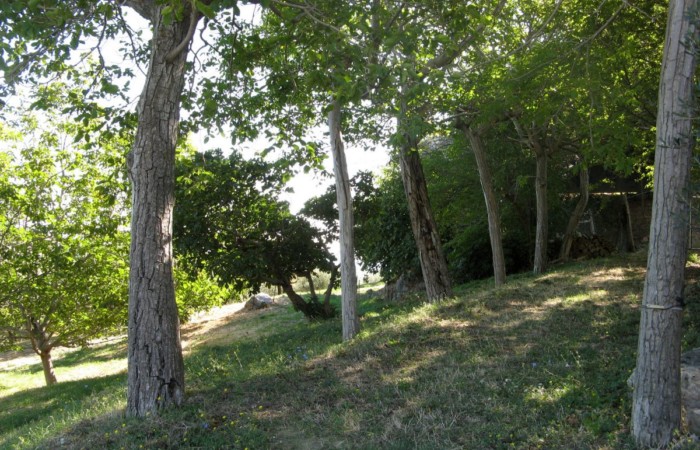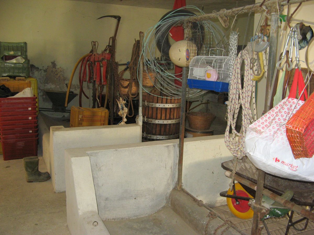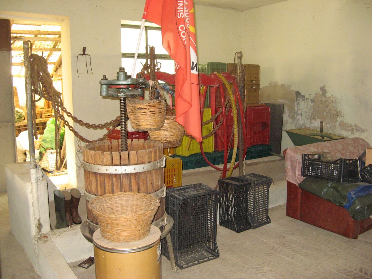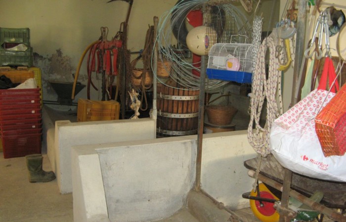 This two-story house, resulting from the merger of three terraced units (200 sq m), was renovated and completed in 1990. The house is located on a slight slope, so the ground floor is entirely occupied by the living area (with two bedrooms and one bathroom), while the basement contains cellars and utility rooms. Adjacent to the house is another uninhabited property (possibly for purchase from another owner) that shares the access road and the courtyard in front of the entrance. In front of the house, facing downhill, is a large fenced space with several outbuildings and utility rooms (146 sq m). The arable land is primarily behind the house on the raised level, while the olive groves extend below, with 123 productive trees (total 11,235 sq m).