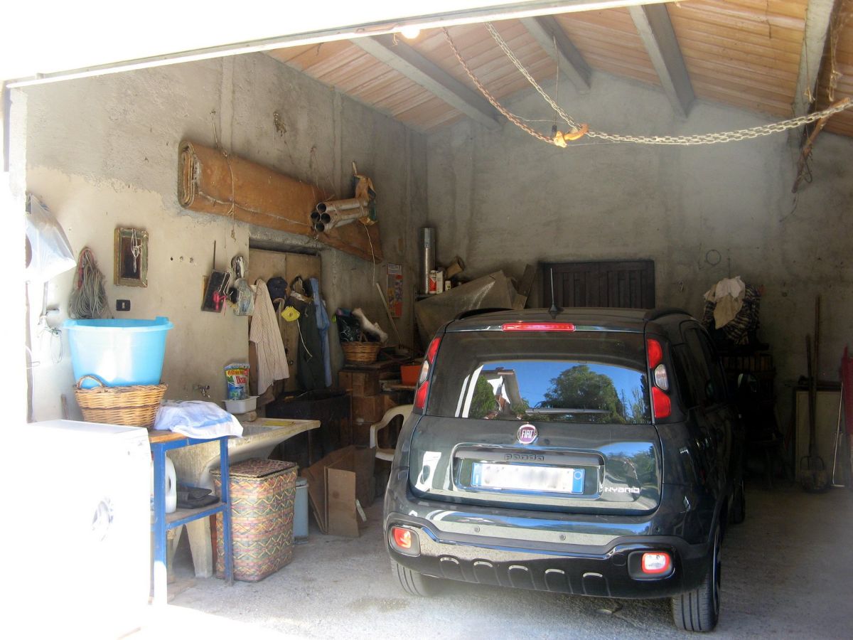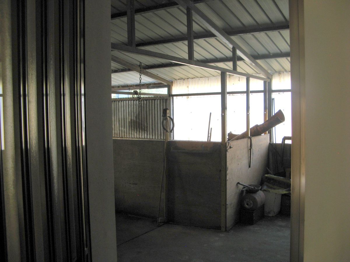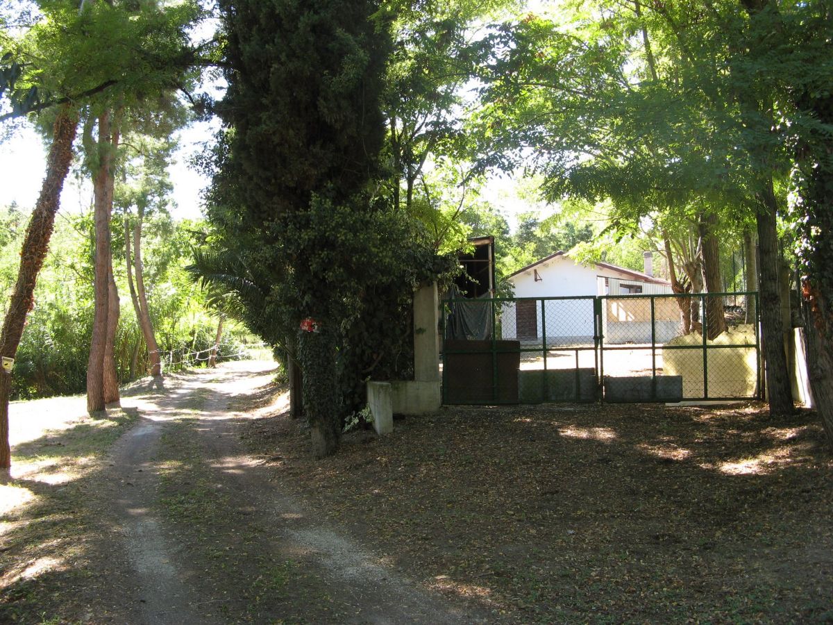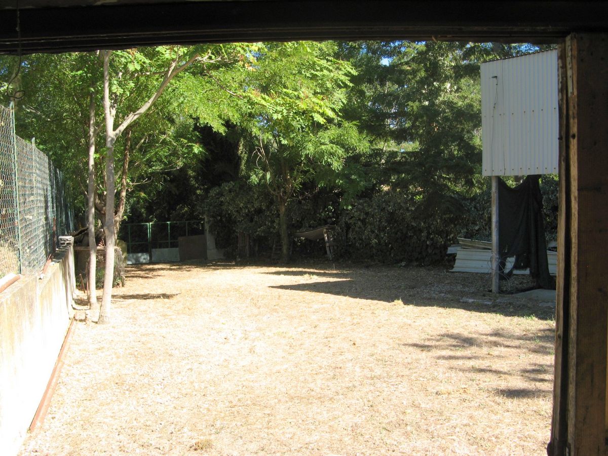 Within the fenced area is a large warehouse, divided into a garage, cellar, and storage room with a high exposed roof of iron beams and bricks. This warehouse could also be converted into a living space through a change of use. The warehouse, on the opposite side of the villa, faces a large plot of land with an additional independent gated access. Outside the fenced area, there is some grassy land with tall trees to the front, and a plot of land to the rear with some fruit trees and arable land (which can also be irrigated with reclaimed water) suitable for a lush vegetable garden.