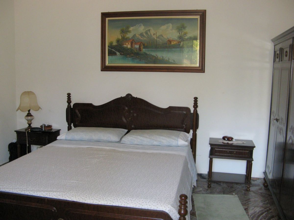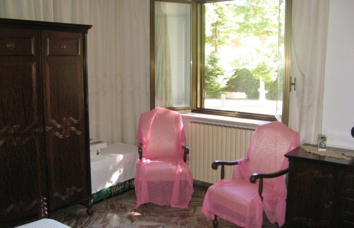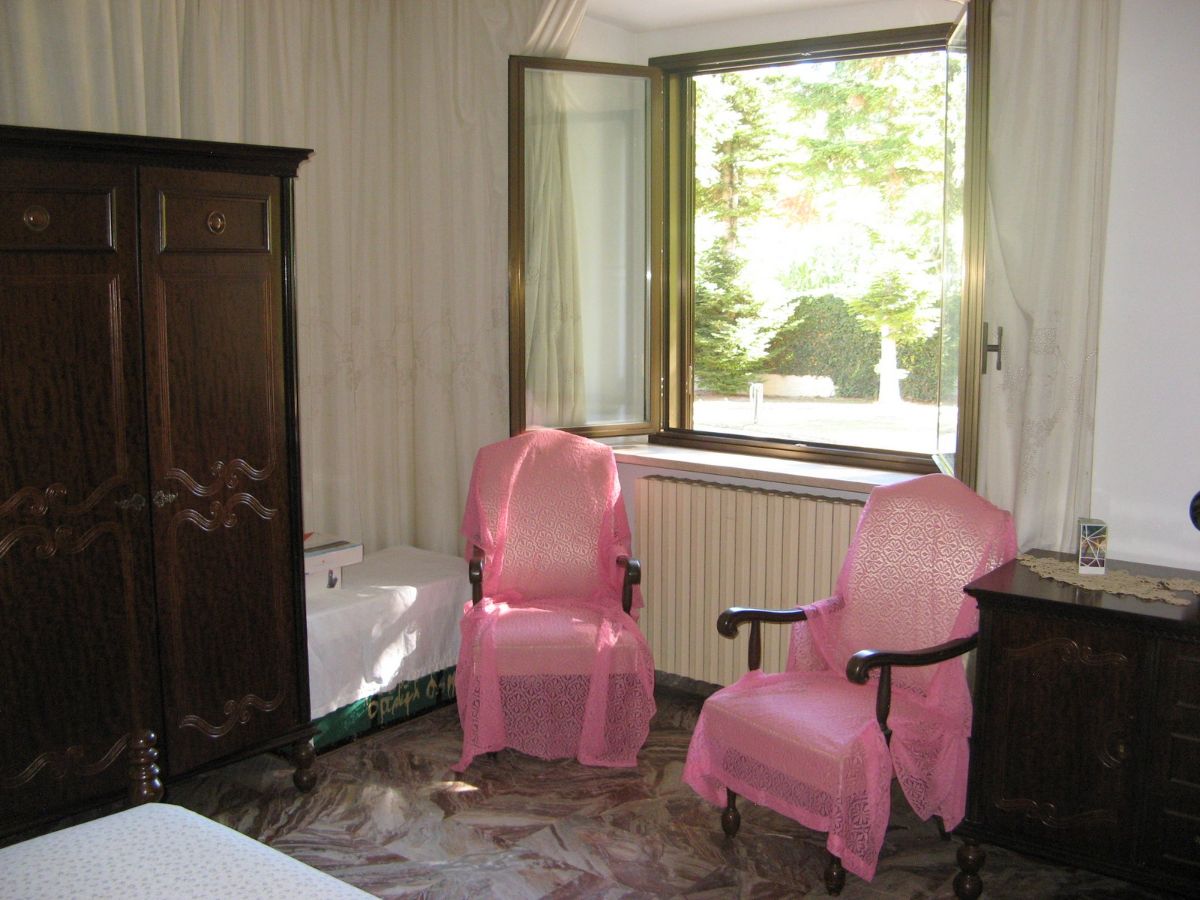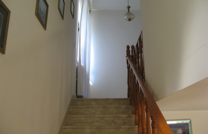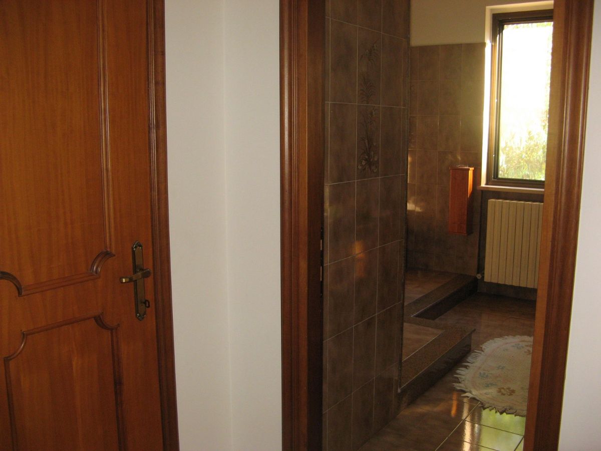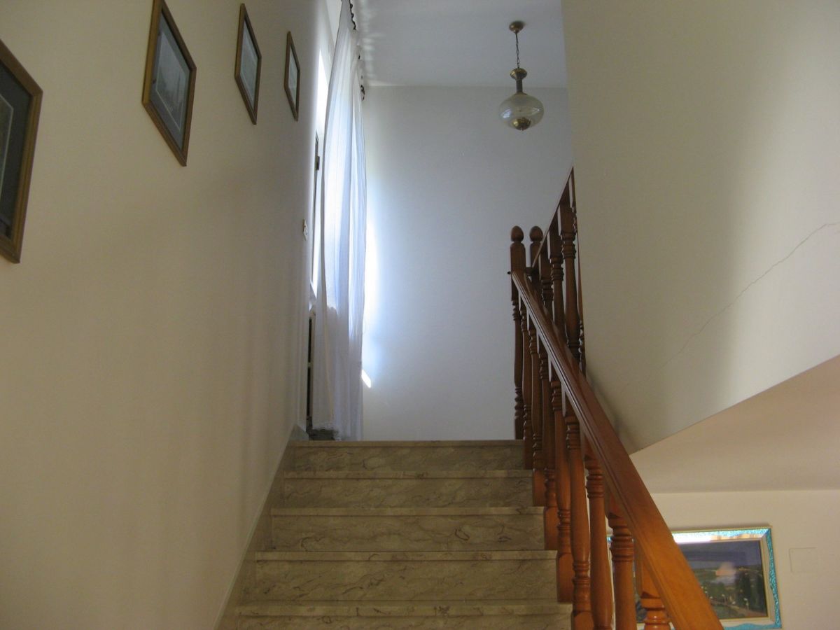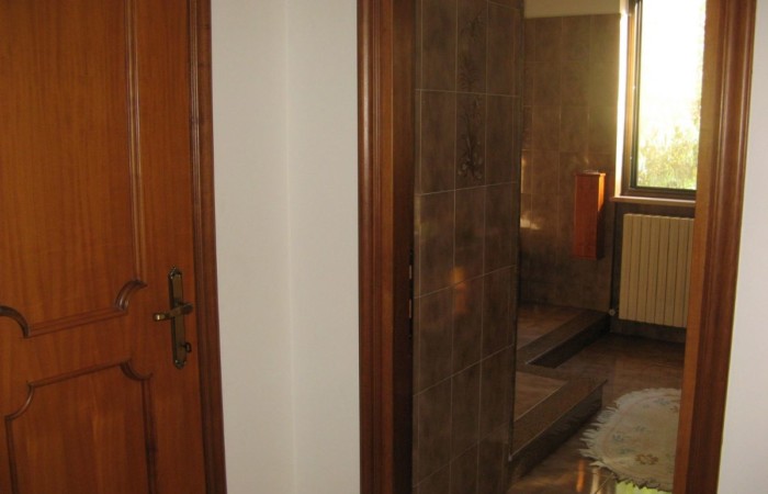 The property is accessed via two sliding gates, one of which is automated, and leads to a lush, partially paved garden with tall trees and decorative plants that fronts the two-story villa. The façade is adorned with a side portico, a long balcony, and a gabled roof that identifies a gable with a high attic. The villa has two entrances on the ground floor on opposite sides of the façade. From the portico, you enter a beautiful living room featuring a bar area with wooden furniture made by a local craftsman. You can then proceed to the dining room and kitchen, or proceed along the long corridor that opens onto another large living room with a fireplace, followed (currently) by an open-plan bedroom; at the end, a bathroom with a bathtub. The entrance on the left of the façade leads directly to a foyer with a storage room that connects to the long corridor and, more importantly, the start of the beautiful marble staircase with a wooden banister that leads to the upper floor. The first floor immediately features a luxurious and comfortable bathroom with a bathtub, followed by a long corridor leading to three large bedrooms, two of which have balconies, and a dining room/study. The corridor ends on a remarkable terrace that offers panoramic views of the surrounding area. Next to the villa is a first garage and a series of utility rooms.