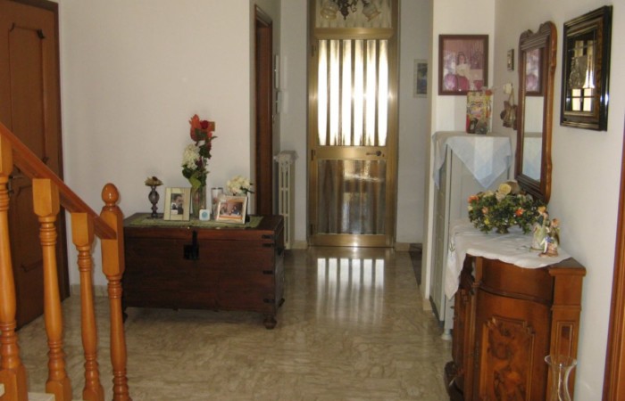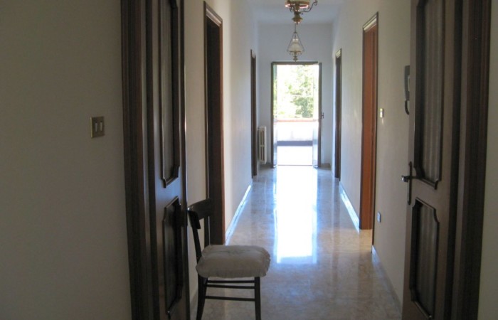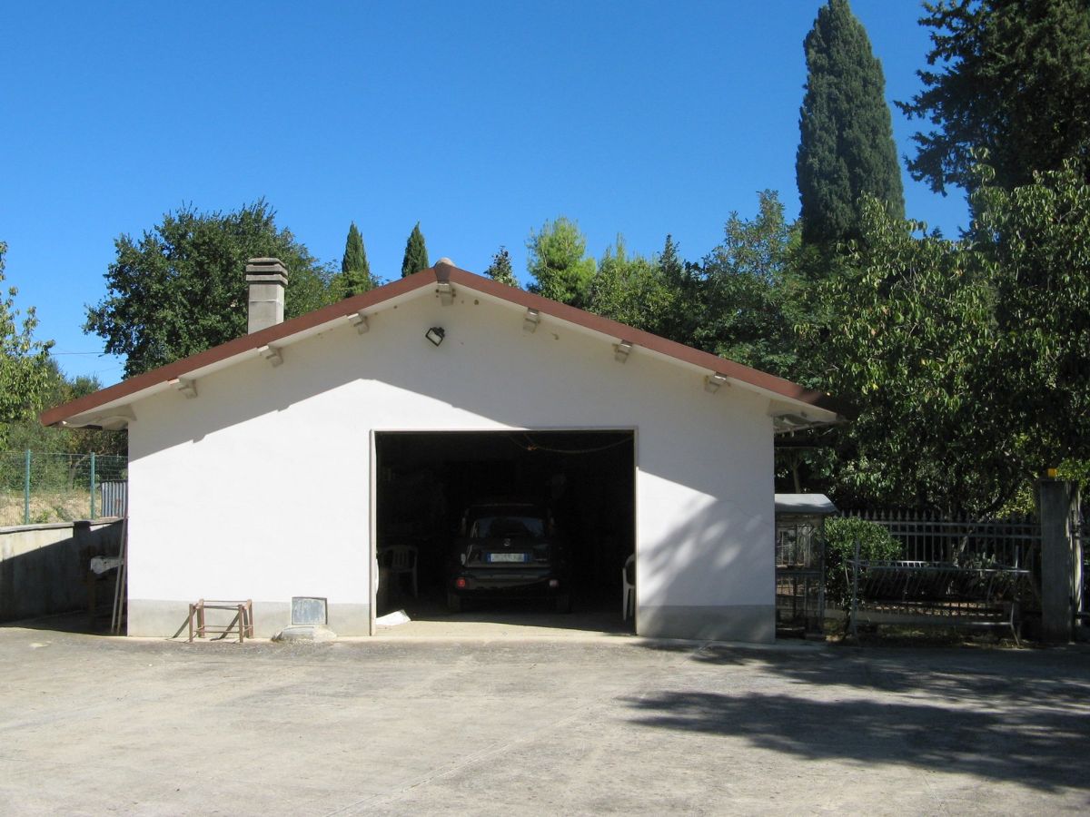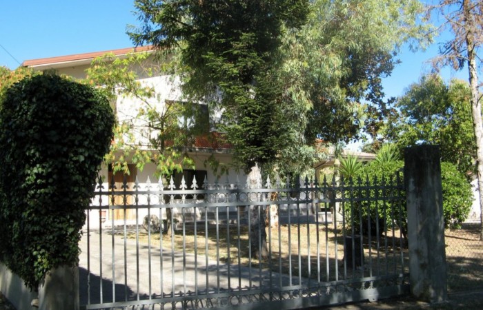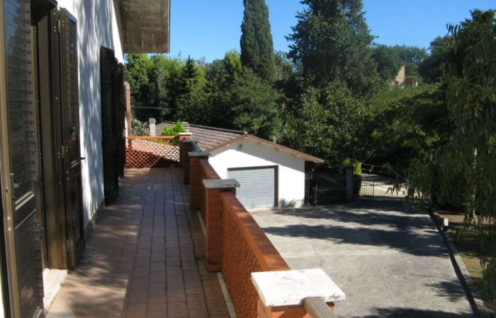 Si accede alla Proprietà tramite due cancelli scorrevoli di cui uno automatizzato e ci si trova in un rigoglioso giardino, in parte pavimentato, con alberi di alto fusto e piante decorative che fronteggia la villa su due piani. La facciata è abbellita da un portico laterale, un lungo balcone ed il tetto a due falde che identifica un timpano con alto sottotetto. La villa ha due ingressi al piano terra ai lati opposti della facciata, dal portico si entra in un bel soggiorno impreziosito da un settore bar con mobili in legno realizzati da un artigiano locale, si può quindi procedere verso la successione di sala da pranzo e cucina, oppure procedere sul lungo corridoio su cui affacciano un altro grande soggiorno con camino cui segue (attualmente) una camera da letto a vista; in fondo un bagno con vasca. L’ingresso a sinistra sulla facciata porta direttamente ad un atrio con ripostiglio che si ricollega al lungo corridoio e soprattutto da cui parte la bella scala in marmo con ringhiera il legno che porta al piano superiore. Il primo piano presenta subito un lussureggiante e comodo bagno con vasca, quindi un lungo corridoio su cui si affacciano tre ampie camere da letto di cui due con balcone ed un sala da pranzo / studio. Il corridoio termina sul notevole terrazzo che offre vista panoramica su tutto il territorio circostante. A fianco della villa un primo garage ed una successione di locali tecnici.