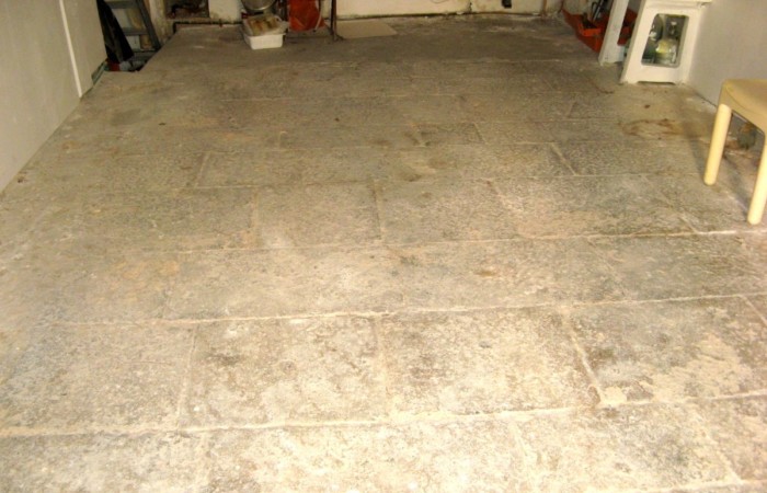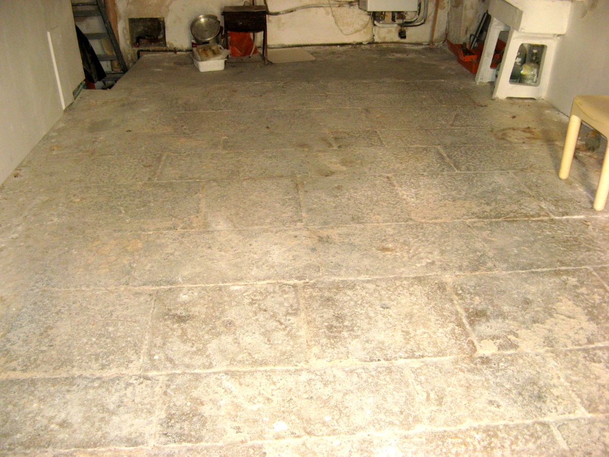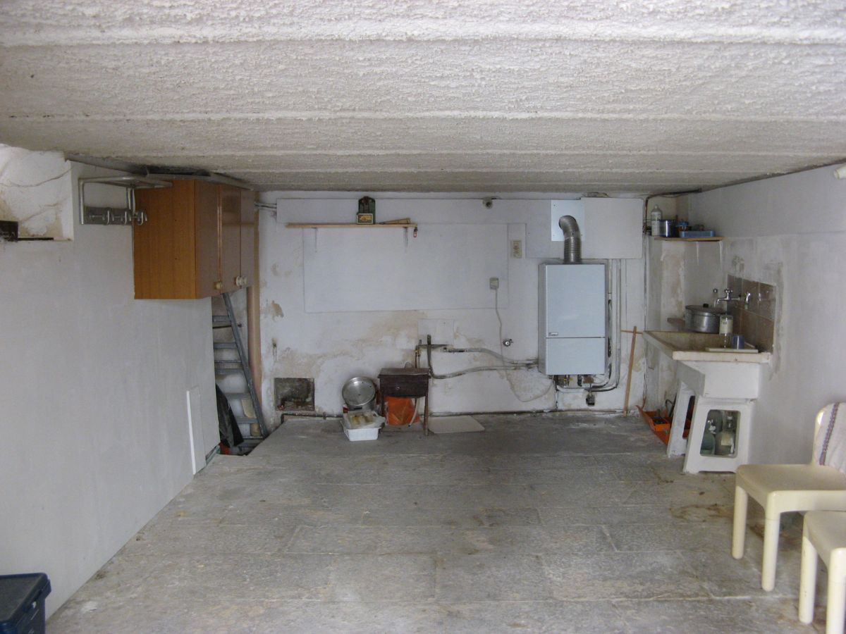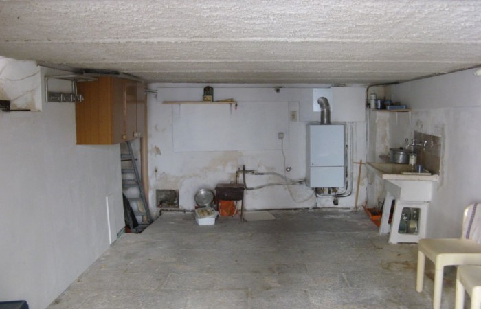 Il garage (35 mq) ha un portale in pietra ed una porta in legno a varie ante, può alloggiare due auto in fila, spicca il pavimento originale in lastroni di pietra, presenti utenze elettrica ed idrica.