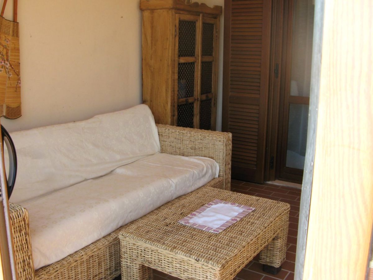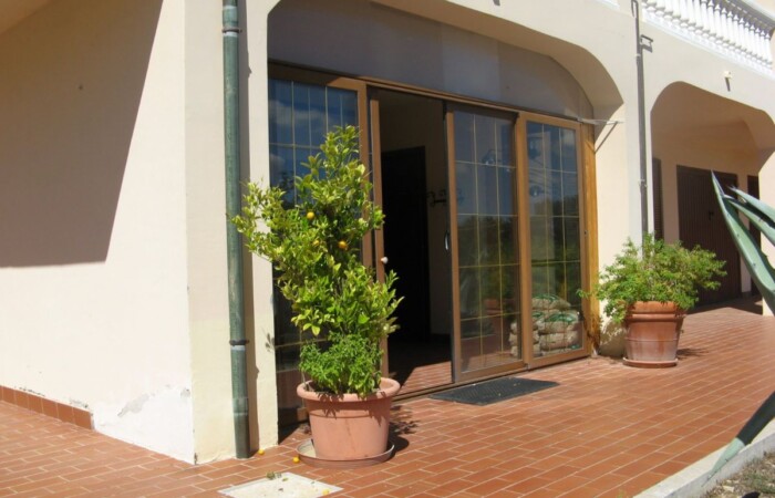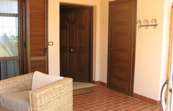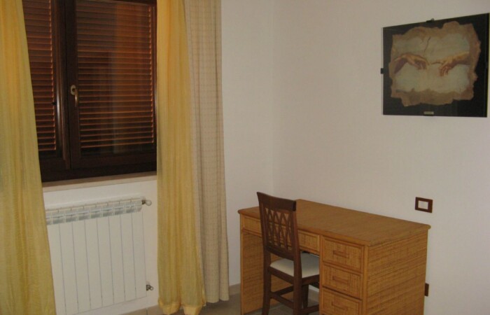 L’ appartamento è preceduto da un ampio portico, chiudibile con eleganti porte vetrate, in cui è attualmente collocato un gradevole soggiorno. Sotto il portico si nota una porta per il vano di alloggiamento della caldaia e la porta blindata dell’abitazione. Entrando ci si trova in un’ampia sala soggiorno affiancata da una cucina abitabile totalmente arredata e quindi un bagno con vasca/doccia. Si prosegue verso la zona notte in cui si succedono due ampie camere da letto ed un ulteriore bagno con cabina doccia.
