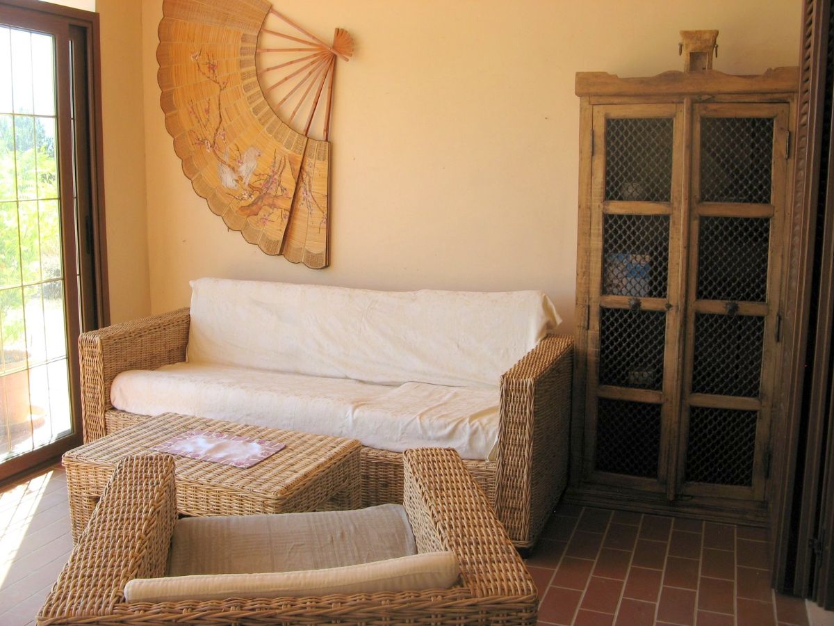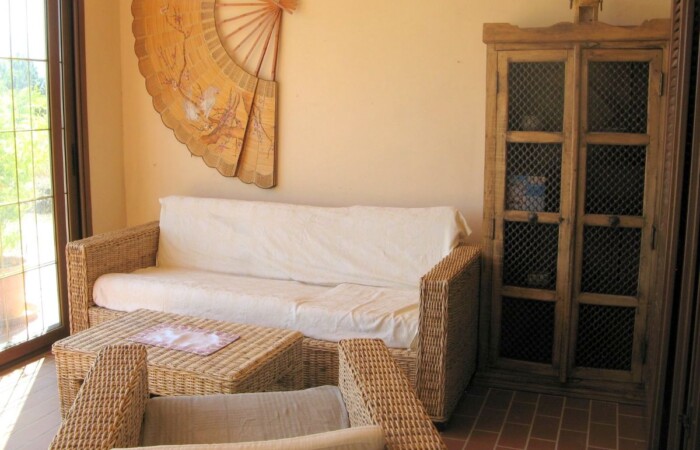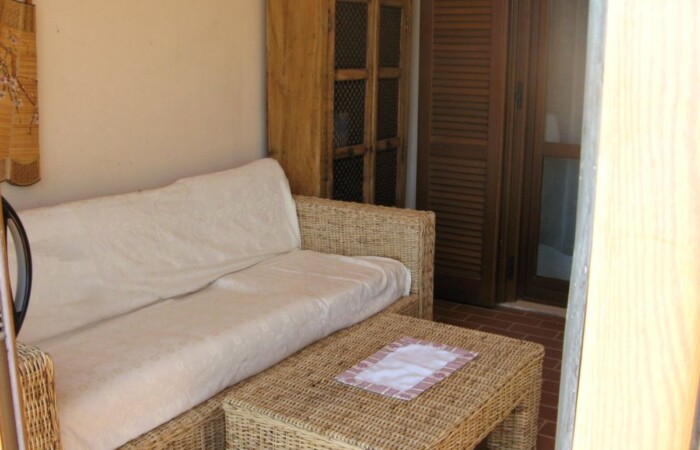The apartment is preceded by a large porch, which can be closed with elegant glass doors and currently houses a pleasant living room. Under the porch, there is a door to the boiler room and the apartment’s security door. Upon entering, you are in a large living room adjacent to a fully furnished eat-in kitchen and a bathroom with a tub/shower. The sleeping area comprises two large bedrooms and another bathroom with a walk-in shower.